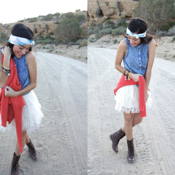 Headband: Lemons & Lace Chambray Top: Silk Sparrow (similar) Sweater: F21 Skirt: Shop in Durango, CO (similar) Boots: Steve Madden