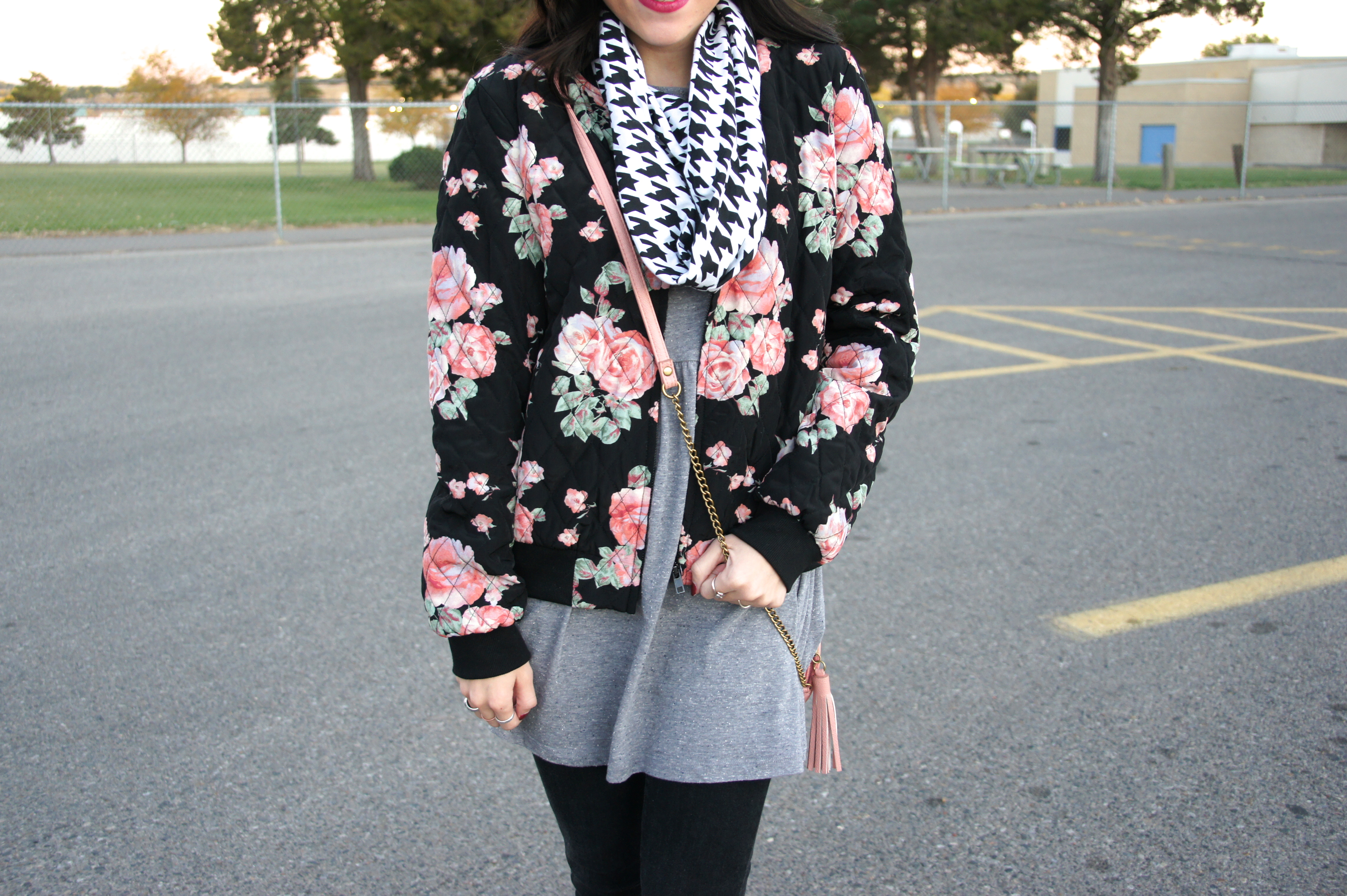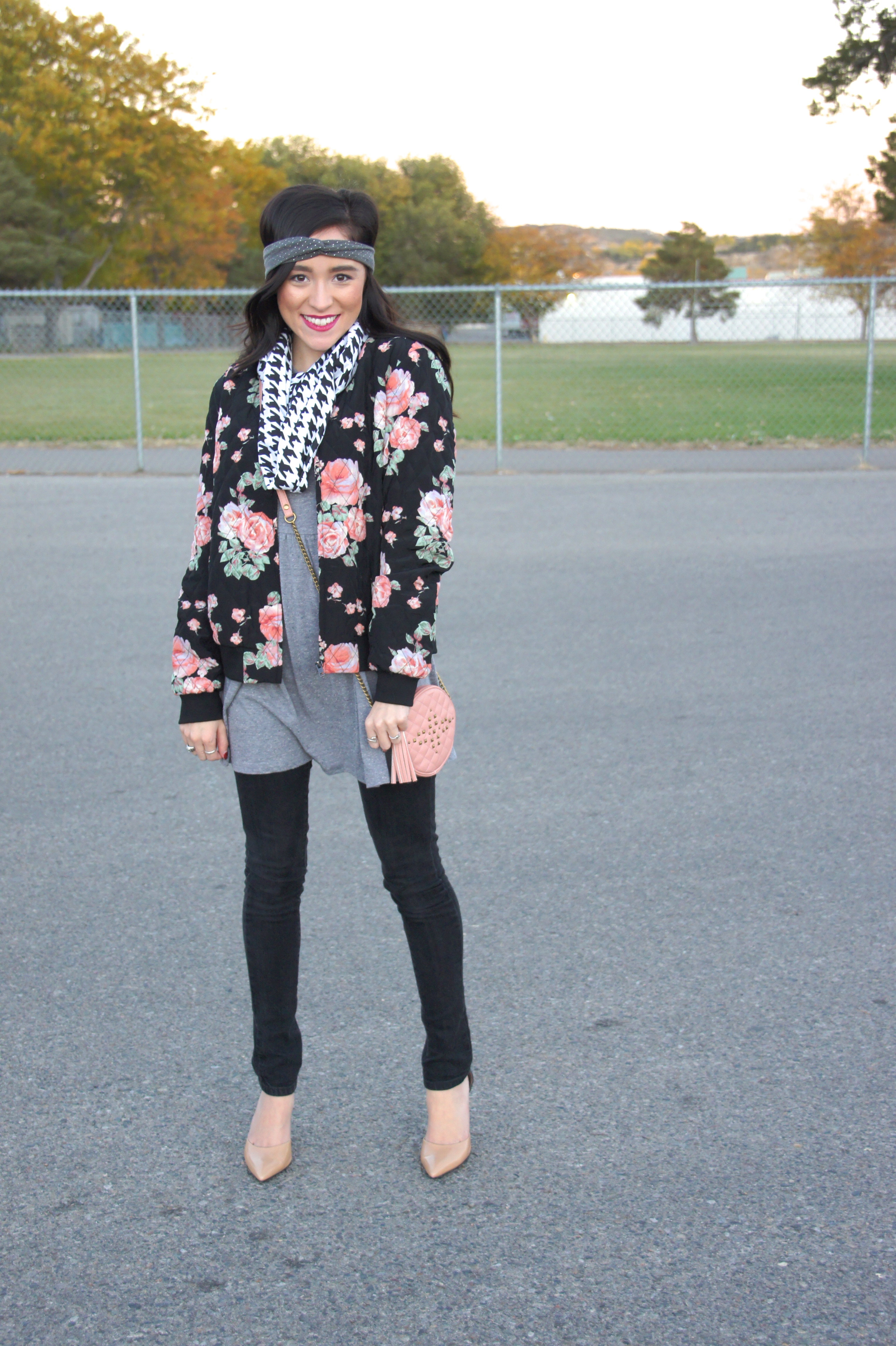 Dress: F21 (similar) Bomber Jacket: F21 Scarf: Monroe & Harlow Headband: Monroe & Harlow Purse: Target Shoes: BCBG Generation