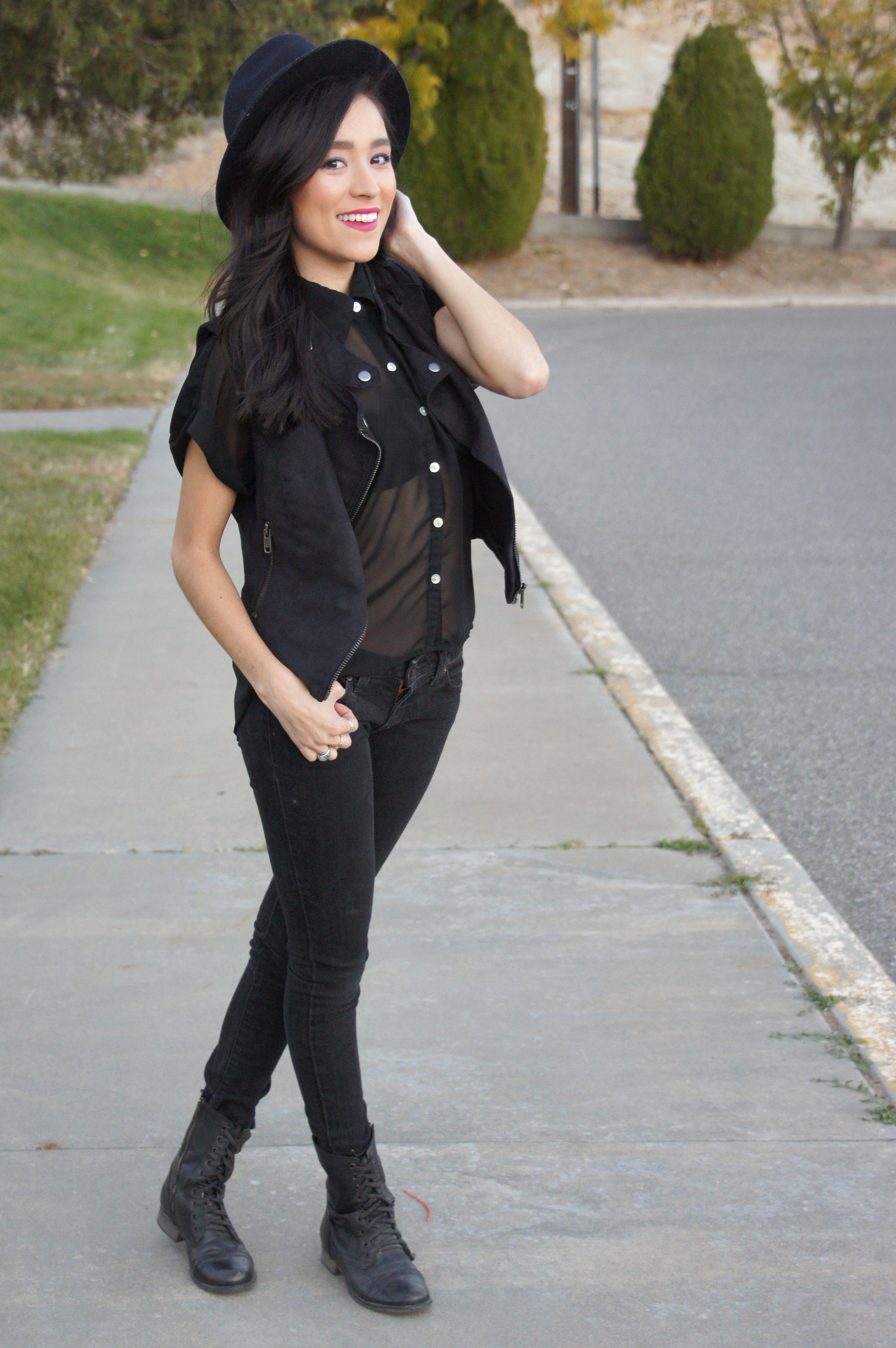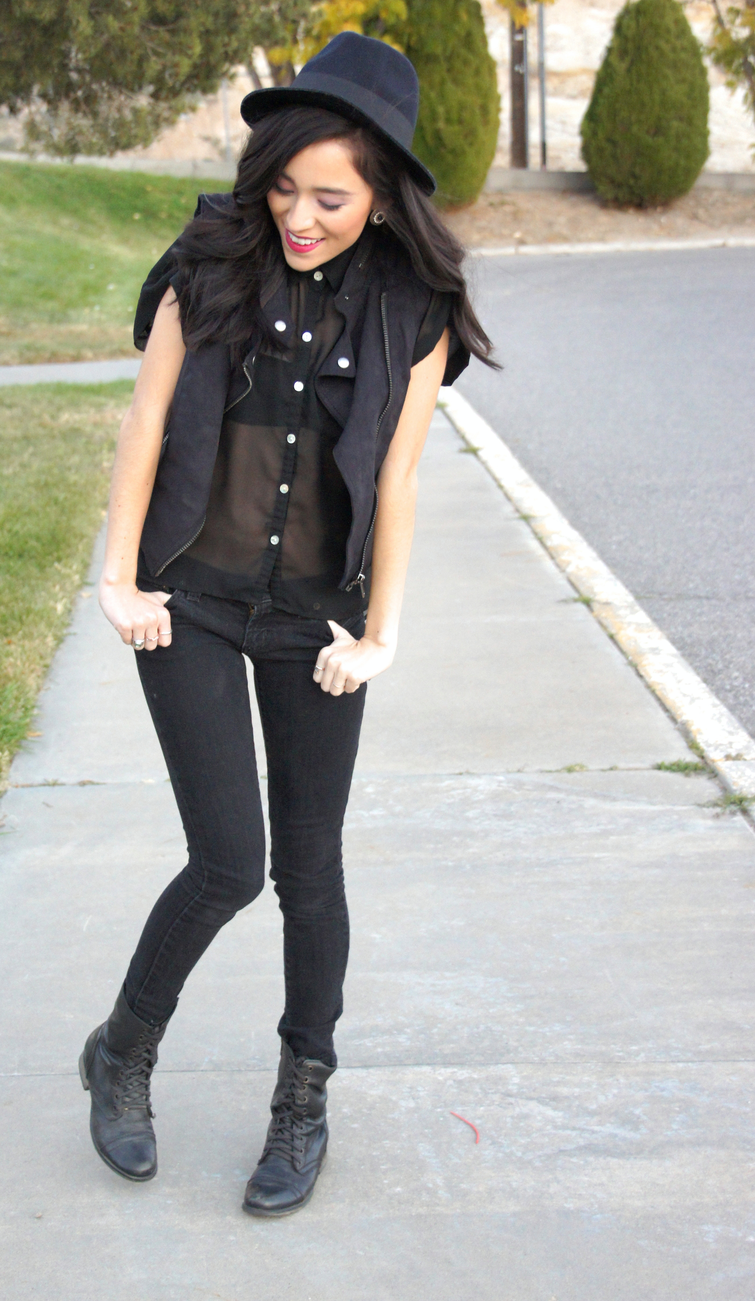 Vest: TopShop London Top: Target Fedora: F21 Earrings: F21 Lipstick: Milani Boots: Steve Madden Jeans: So old I can’t remember 😦