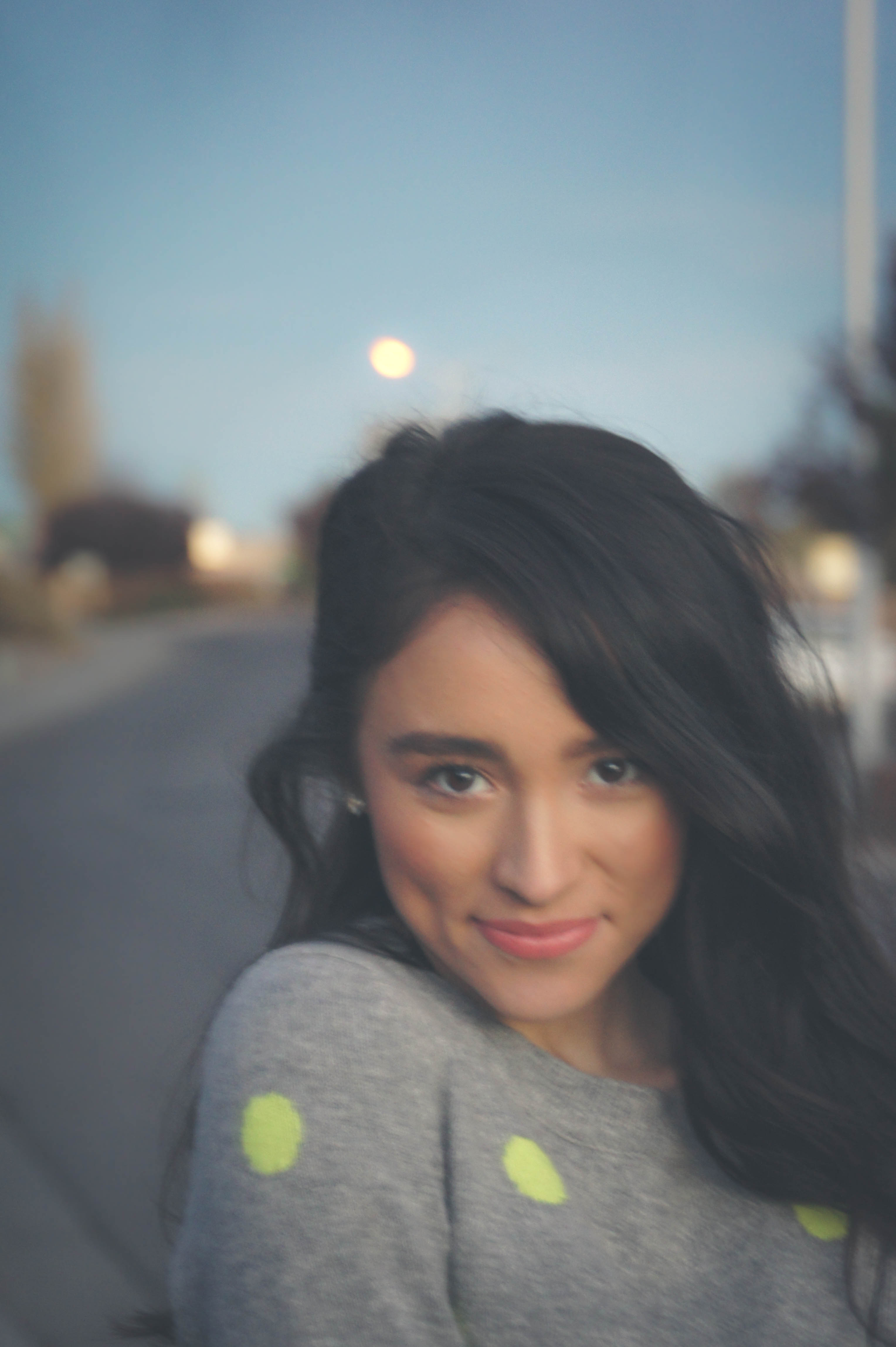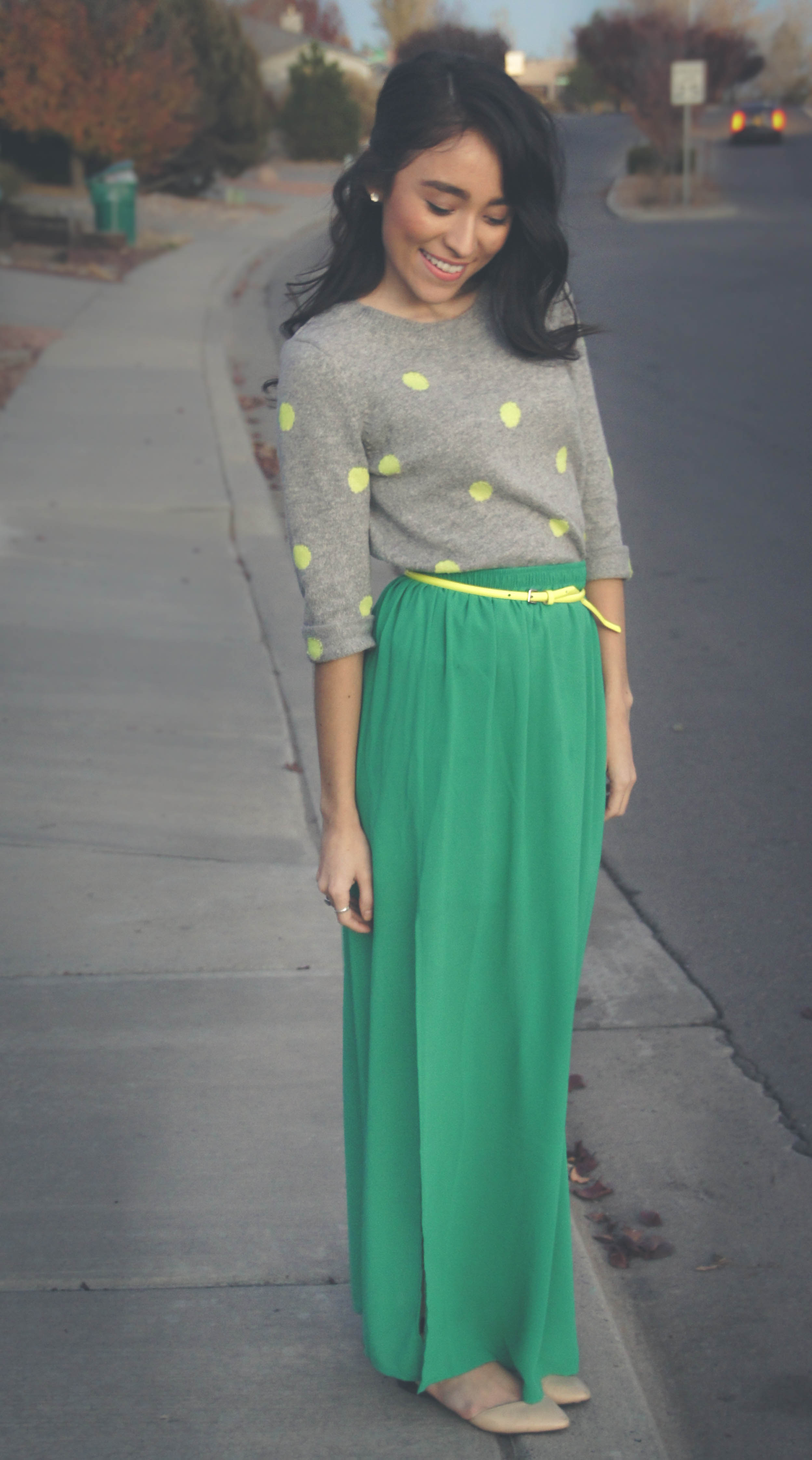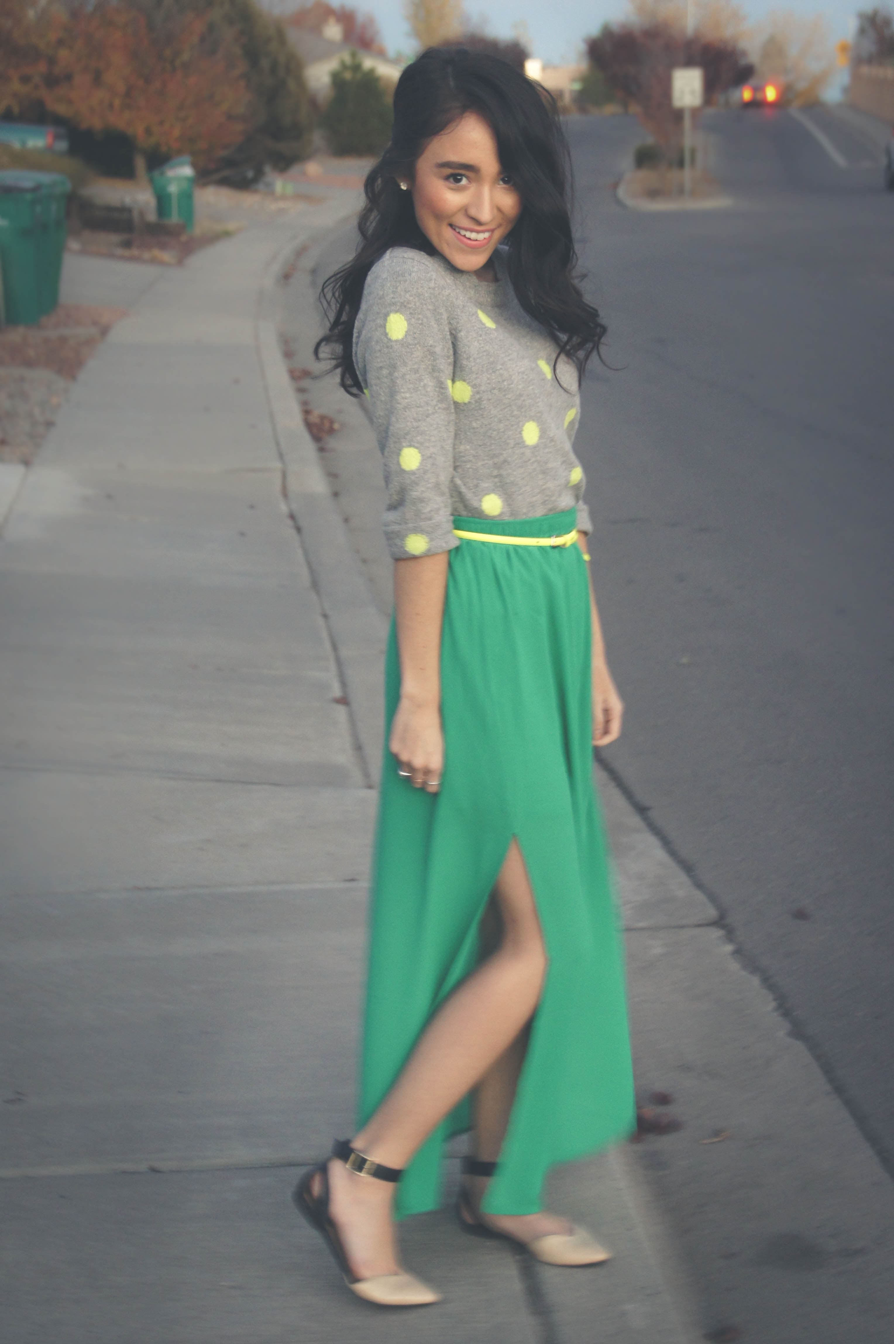 Hey guys. I wanted to take a quick break from the darker colors so I reached for my favorite maxi skirt and polka dot sweater. I also took these pics on a warmer November day, I’m currently bundled up in thousands of blankets because I think I’m actually realizing that it’s November and I need to cover up. Also, I used to wear green every other day in high school because those were our school colors so I don’t own much green besides just a few items. All of my green dance team t-shirts are tucked away and I’ll bring them out once in awhile for memories. By the way, Â I barely caught these pictures before the sun came down so I apologize for the trash cans in background and blurriness. Gross. At least the trash cans match my outfit right? Bazinga.Â