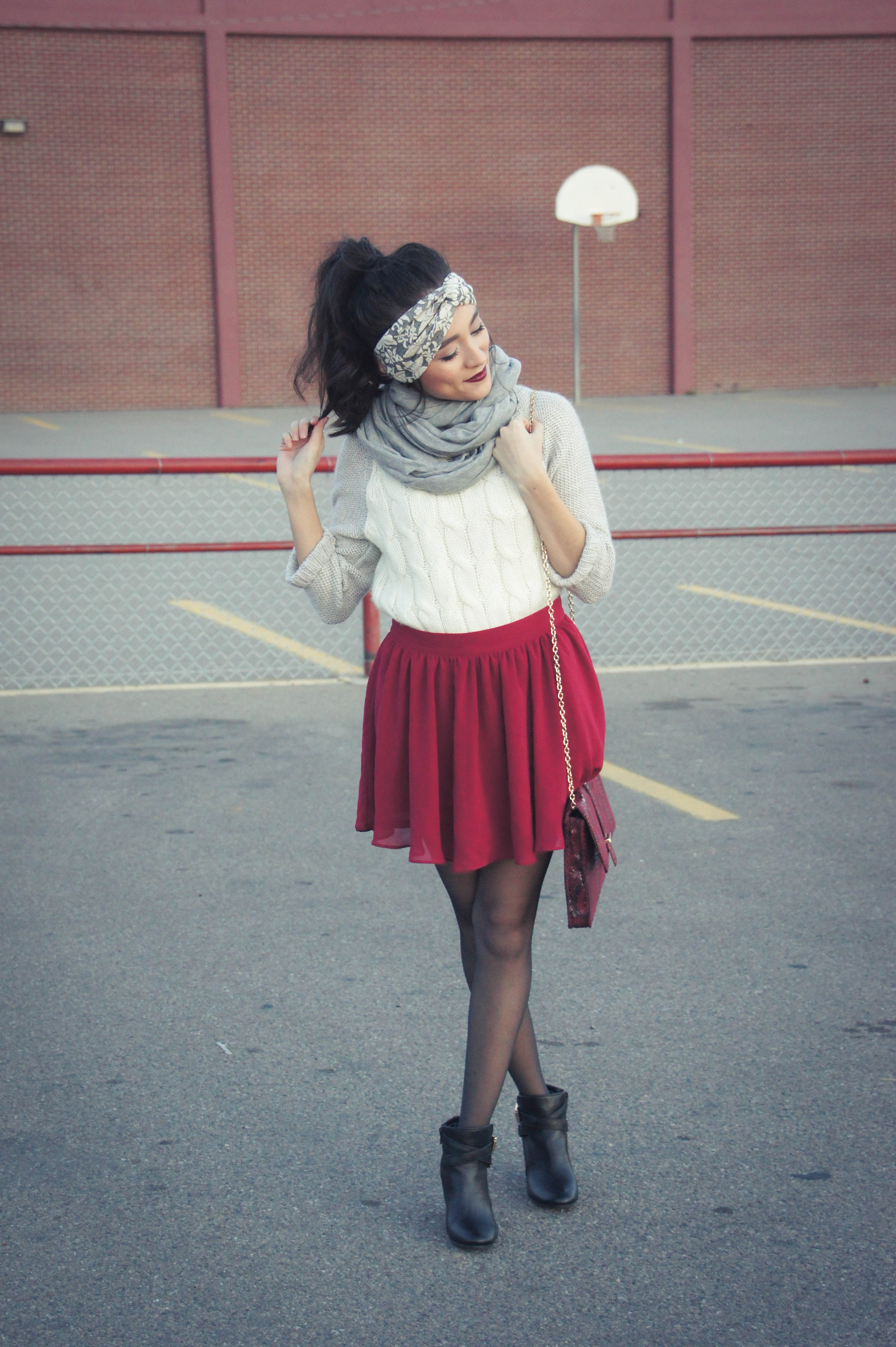 Sweater Weather is the best weather isn’t it? I do love winter, I do. But I love winter from indoors. I have a hard time adjusting my style to the cold weather. I just want to wear what I want to wear. Ya feel me? One good thing about cold weather is all the layering! There’s so many possibilities. I had fun with this look. This wine color scheme is my everything right now. Wine lips. Wine skirt. Wine purse. Check, check aaaand check! I also kept warm with my Monroe & Harlow headband. It was thick enough to keep my ears toast-ay. Bonus!
