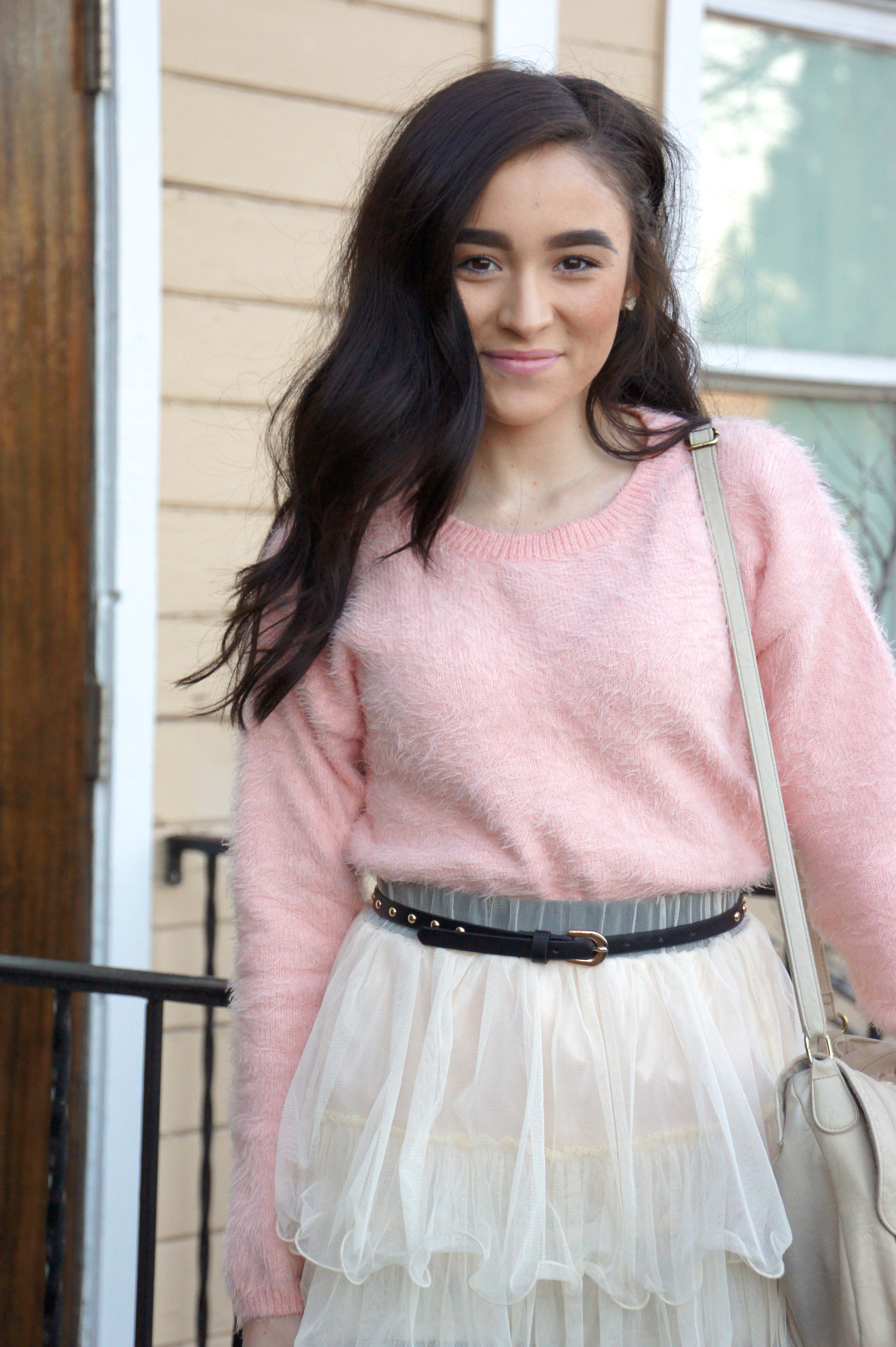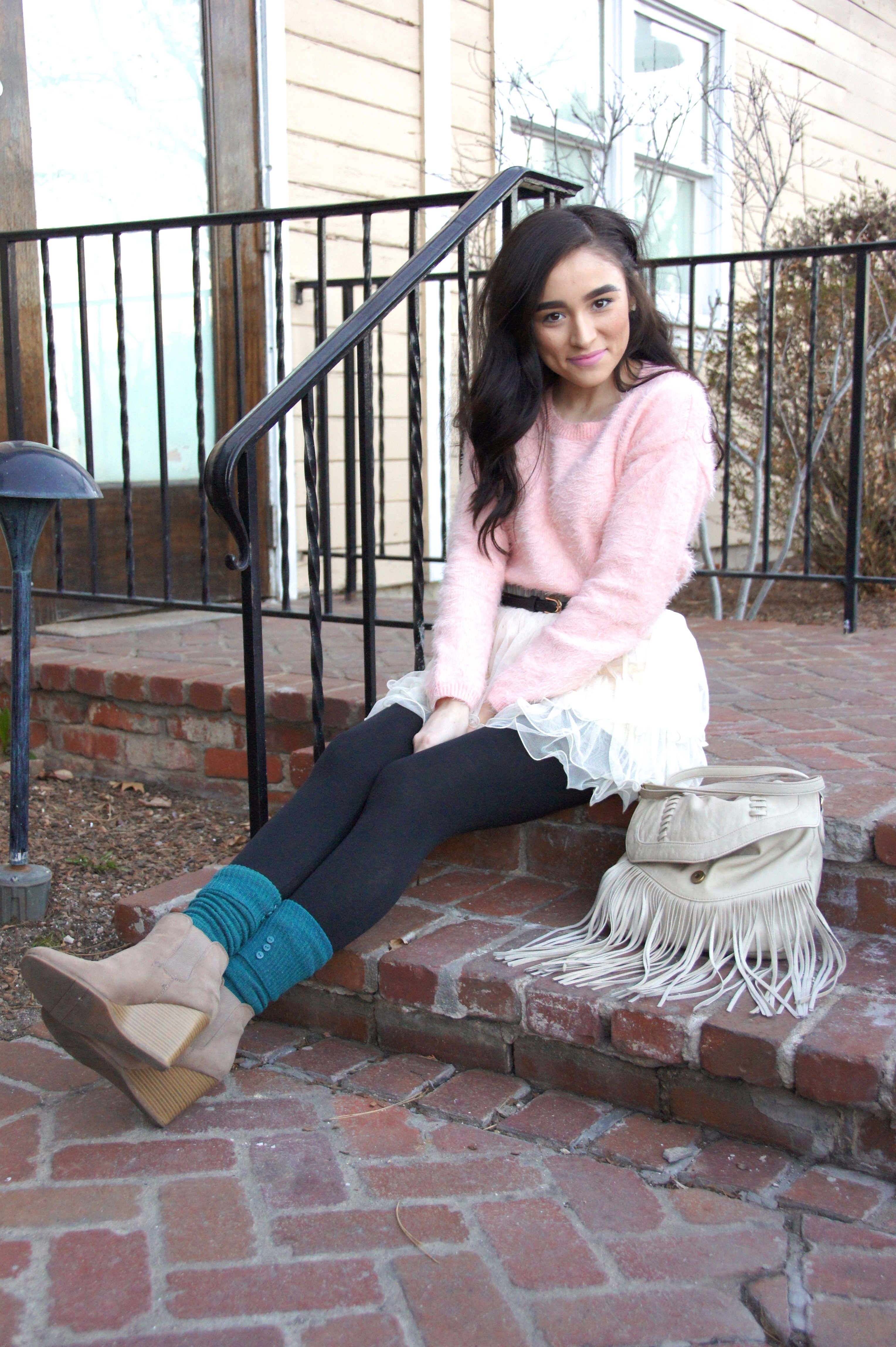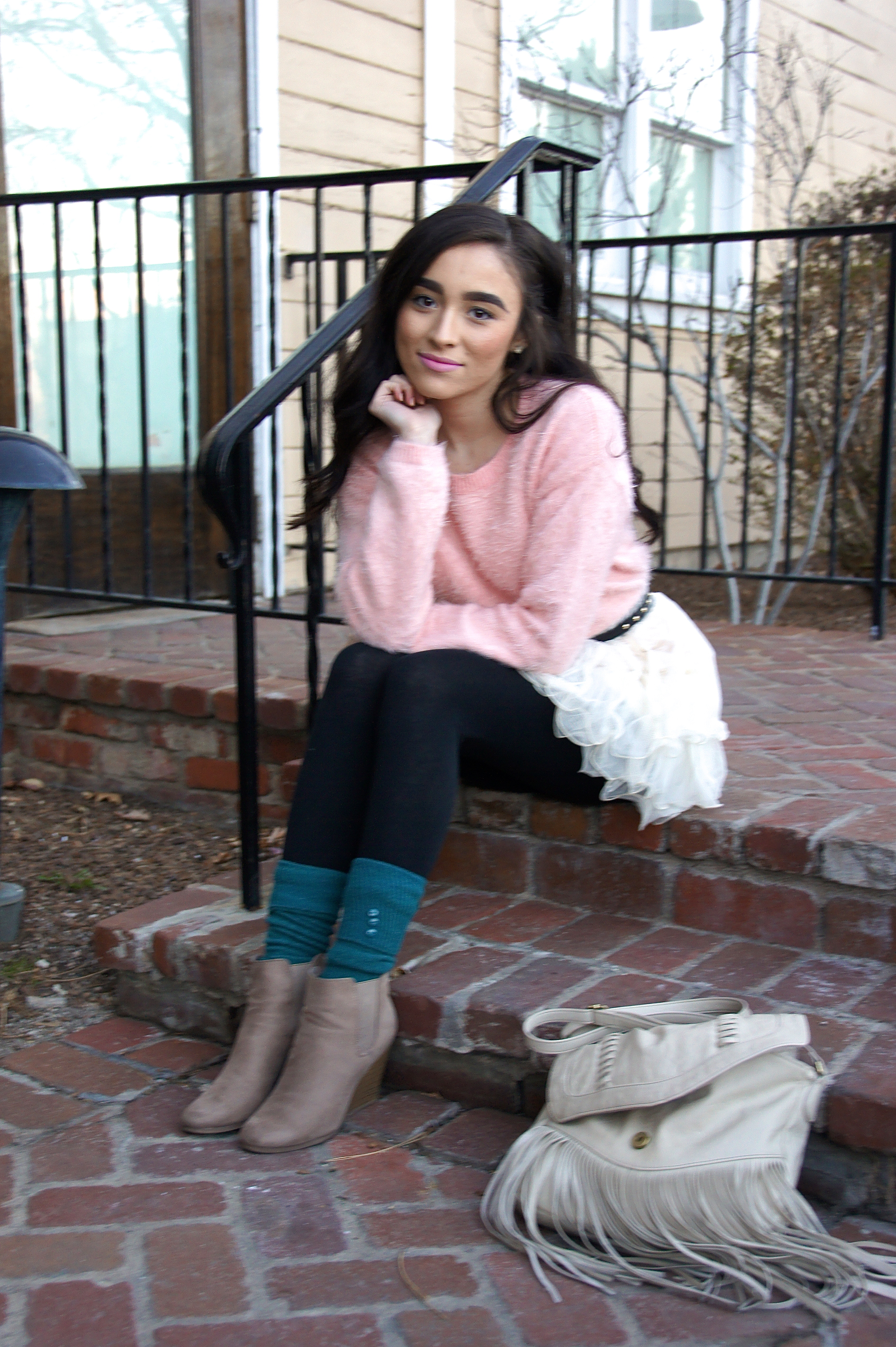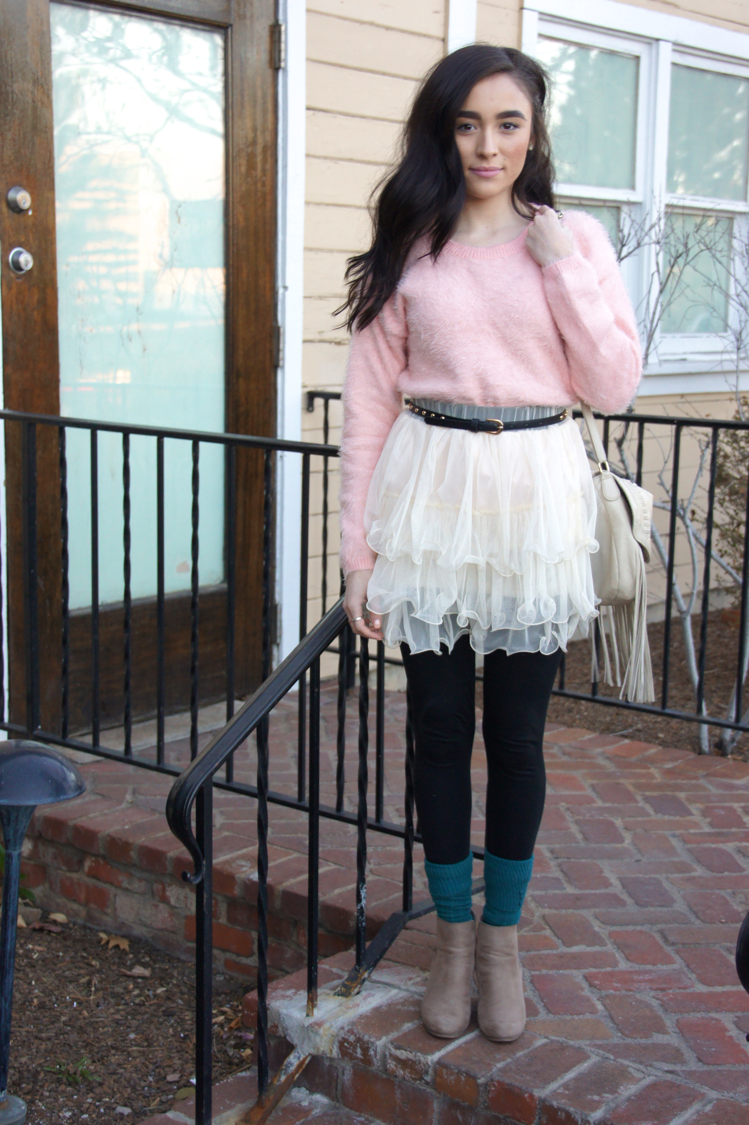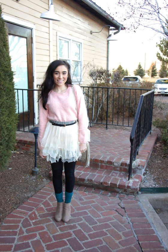I just have to admit that I felt like such a GIRL in this outfit. From the fuzzy, pastel sweater to the head turning tulle skirt to the heels with the teal socks… Head to toe is pure girly-ness and sometimes that’s all a girl really needs…to dress up like a doll.