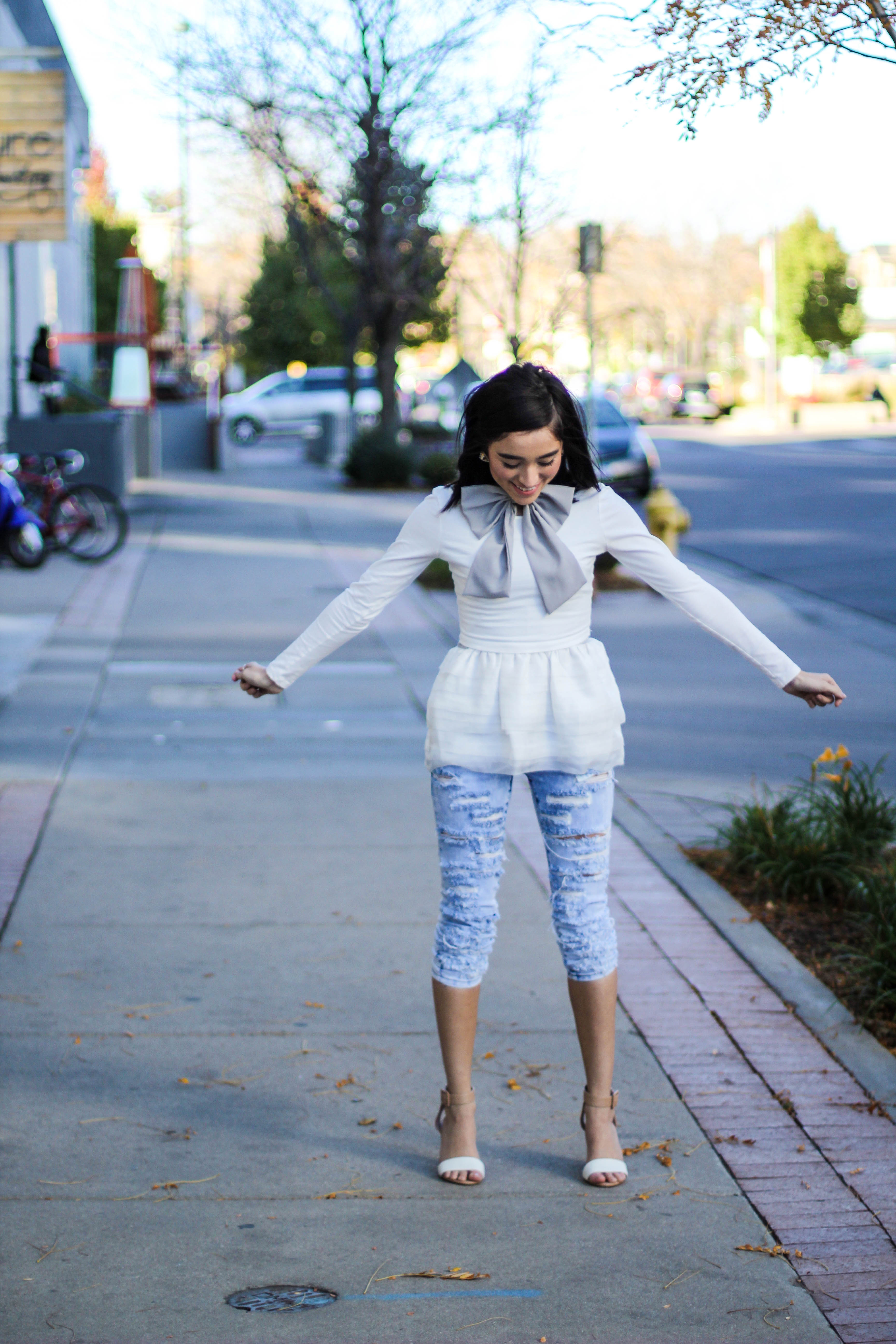 Hi there. This extremely girly ensemble would be nothing without the ripped jeans and this adorable bow tie. The bow tie is detachable so I can pair it with anything I feel like and that’s just awesome. With most outfits I wear, I always try and add a little contradiction. I like pairing items in my closet with other things that just aren’t supposed to go together. For example, these completely ripped jeans paired with this tutu-like top totally contradict each other. It’s small and probably insignificant but it’s one of my trademarks. I absolutely love it when people say, “I would have never paired that with this until I saw you do it.” It’s all about being open to the possibilities that one single outfit can bring. Add something edgy to a girly outfit. Add something girly to an edgy outfit. Those are some tips I’m leaving for you. I hope you try it sometime this week. Take baby steps if you have to. Fashion is so much fun but it’s only fun if you join in too.