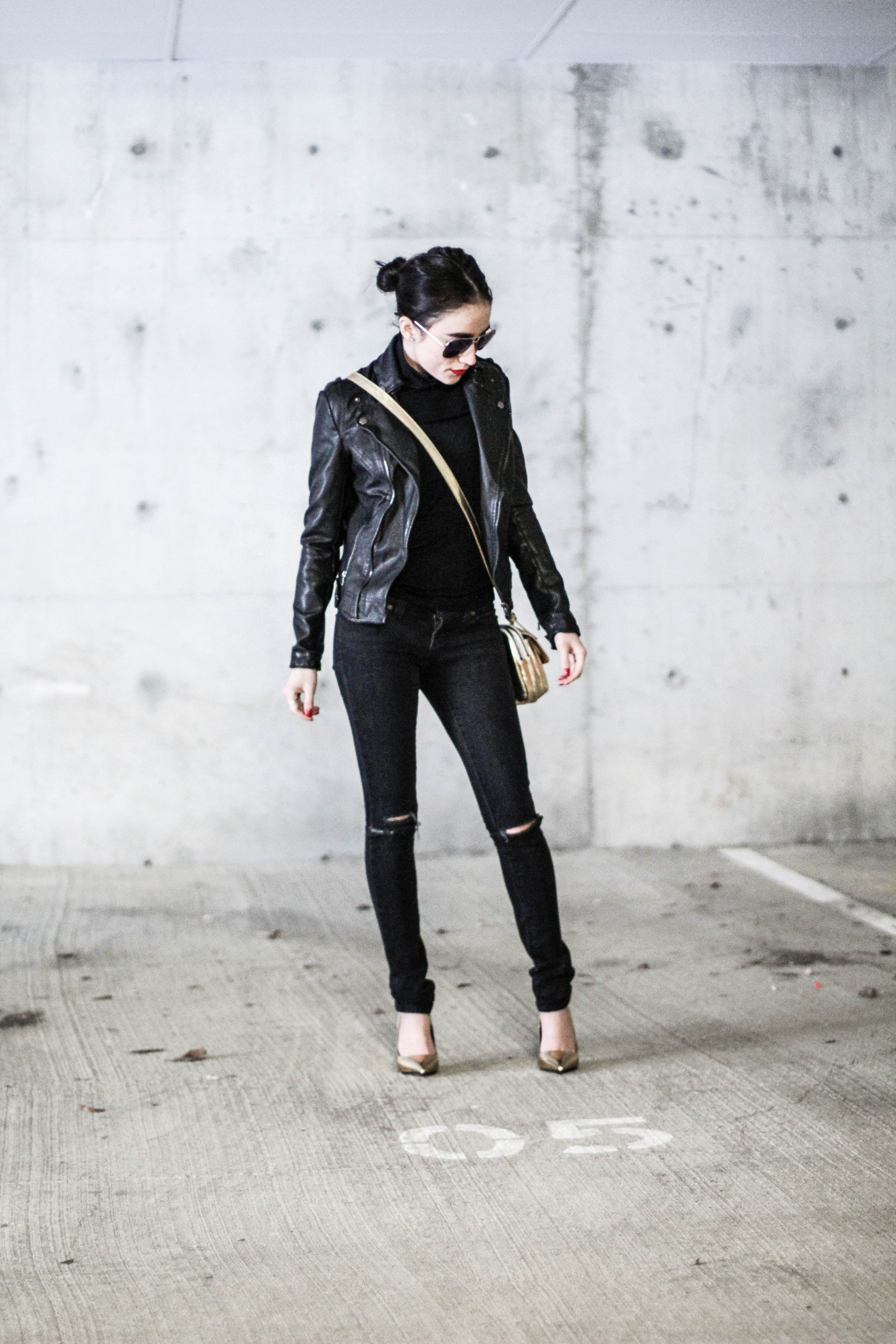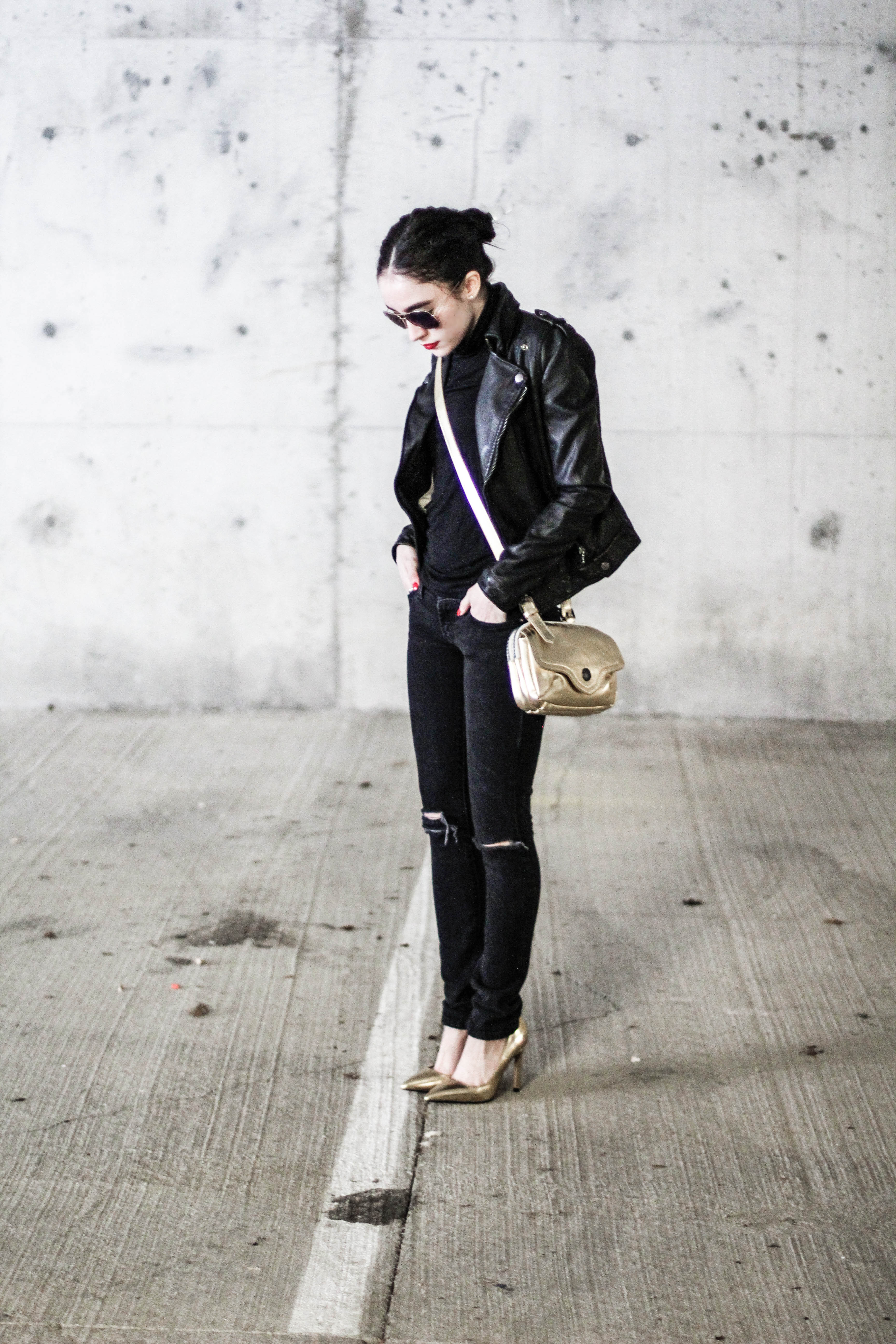 Leather Jacket. Turtleneck. Jeans. Shoes-ZARA (SIMILAR). Purse. Sunglasses.
