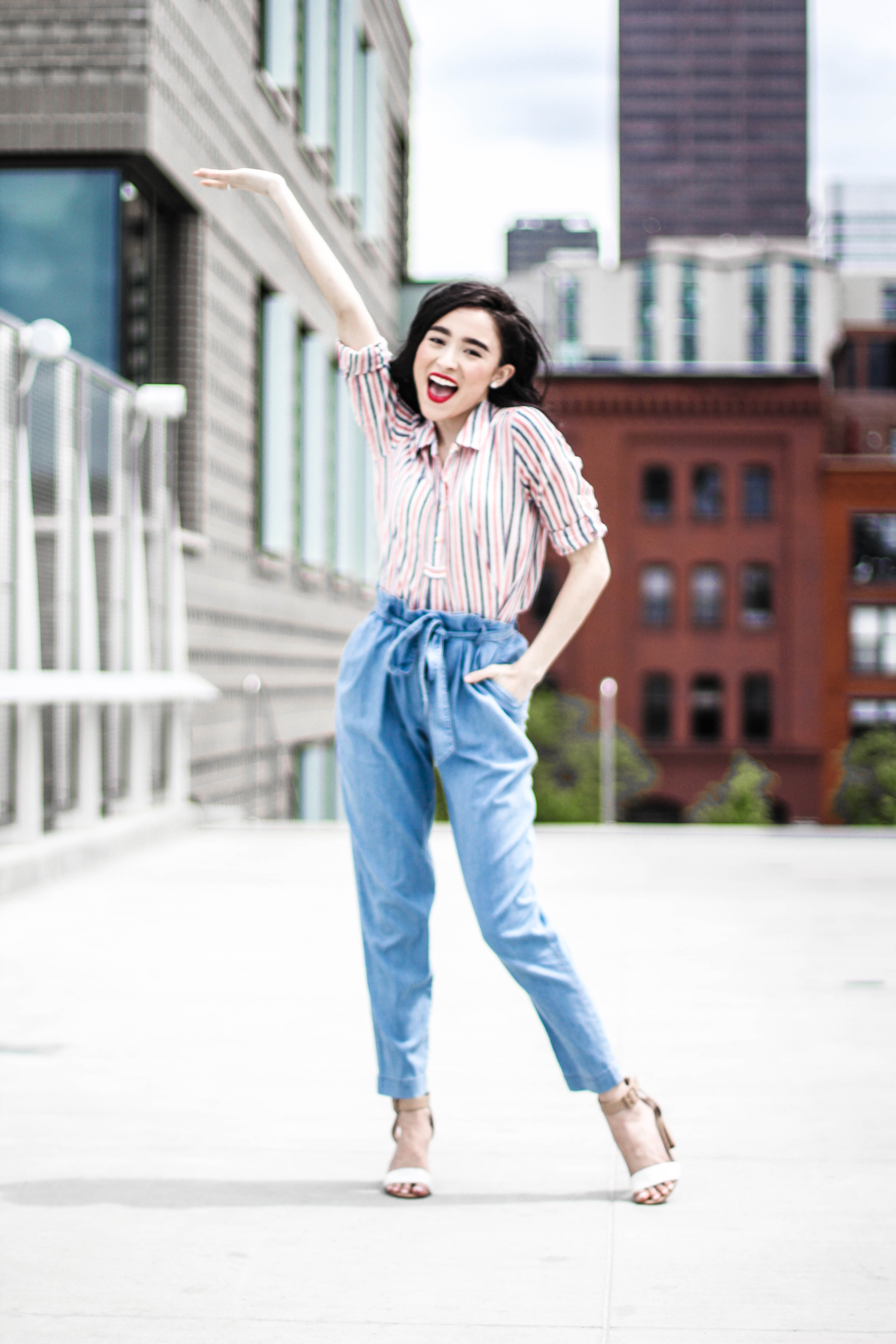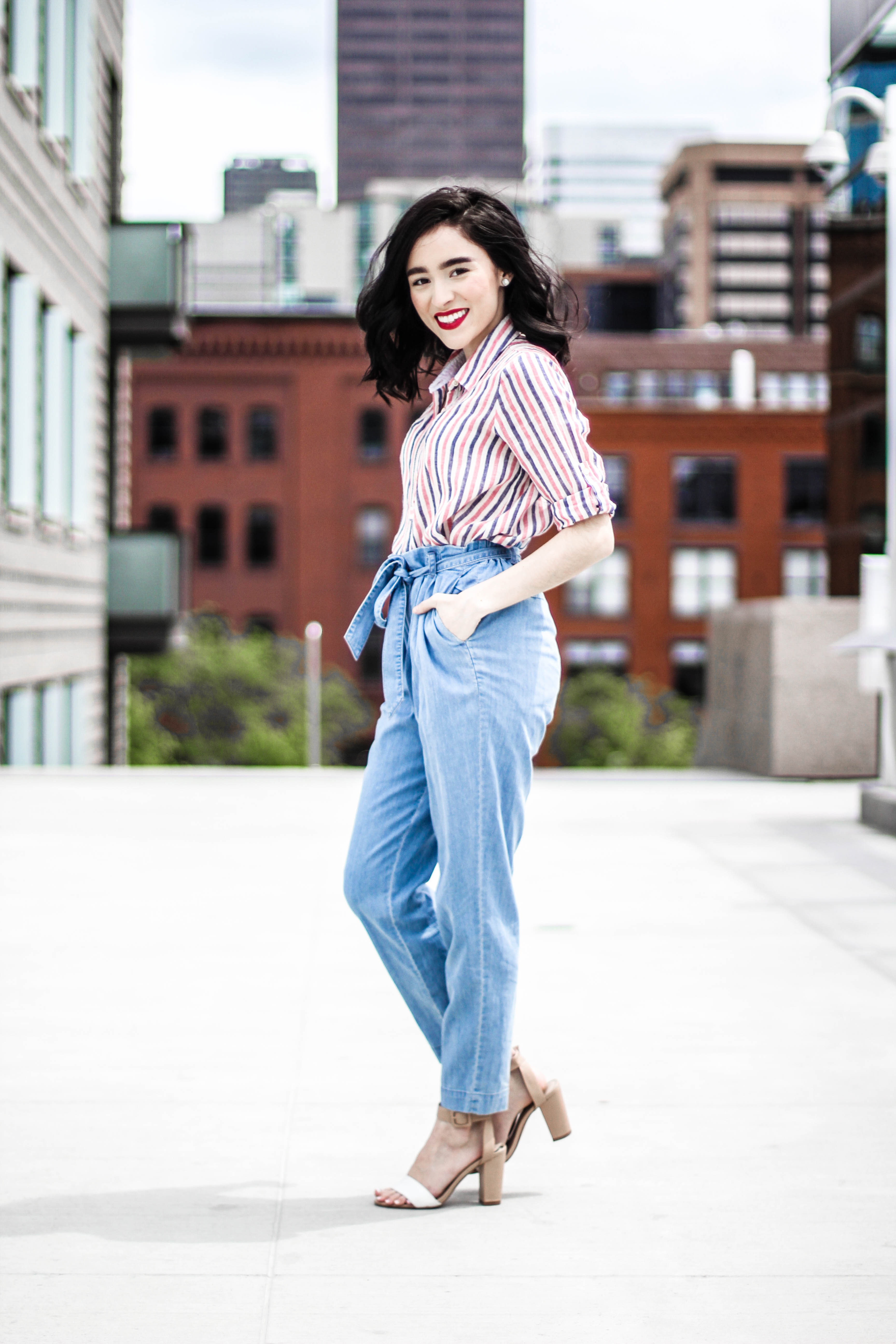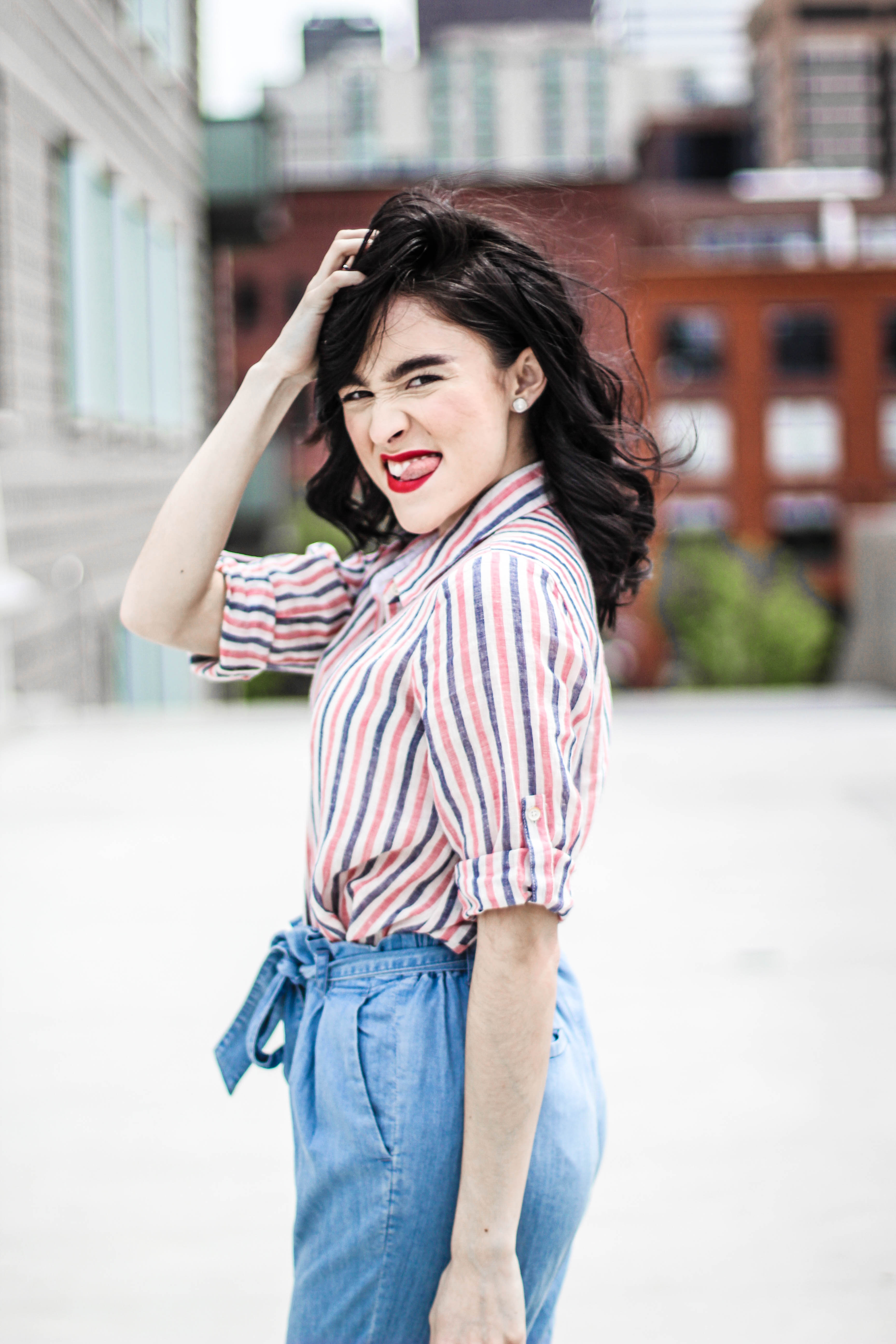 I mean, based on the pictures, can’t you tell how much fun I’m having in my little button down? Wearing button-downs don’t have to be so boring, ladies. In fact, they are the opposite but that’s all up to how you decide to wear it. I absolutely love to wear my button downs (or button up, however you want to say it) with a statement skirt or high waisted trousers. I don’t know what I would do without all of my different pairs of high waisted trousers because they have truly evolved my wardrobe into everything that it was meant to be. As a fashion lover, I can’t go a week without throwing on a pair into my daily wardrobe because they are just so versatile and there’s nothing better to spice up a button down. When I first purchased this blue, white and red striped beauty I was worried it was too “Fourth of July-ish” but that’s not the case at all! Also, there’s nothing wrong with representing our country when it’s not a national holiday…Just a regular Monday will do just fine too! When pairing a button down with anything high waisted, I always make sure that that my button-down can be comfortably tucked into my pants. The length of the top makes such a difference. Good thing this hankercheif style of top is so versatile. Tucked in or out, it WILL turn heads.