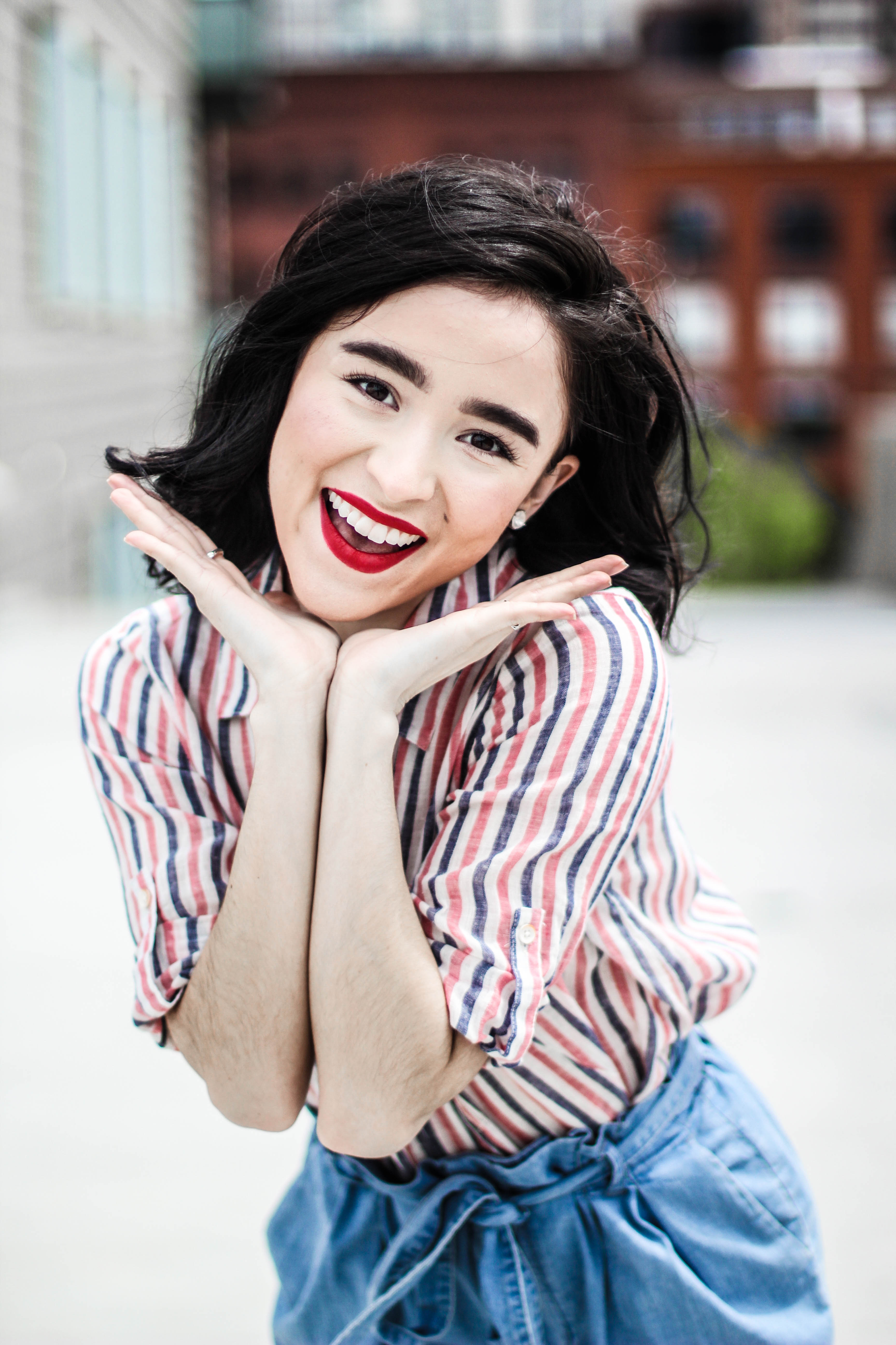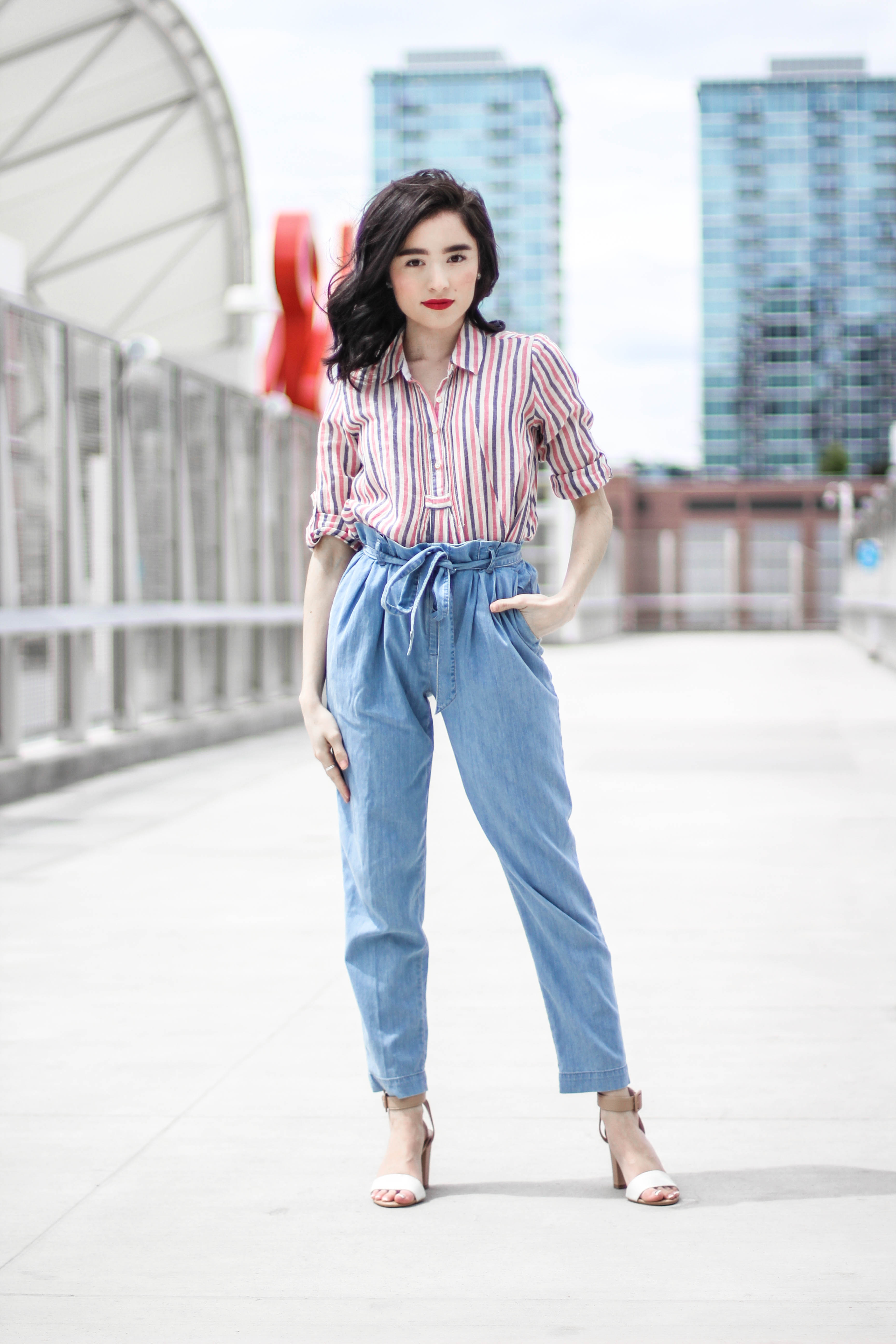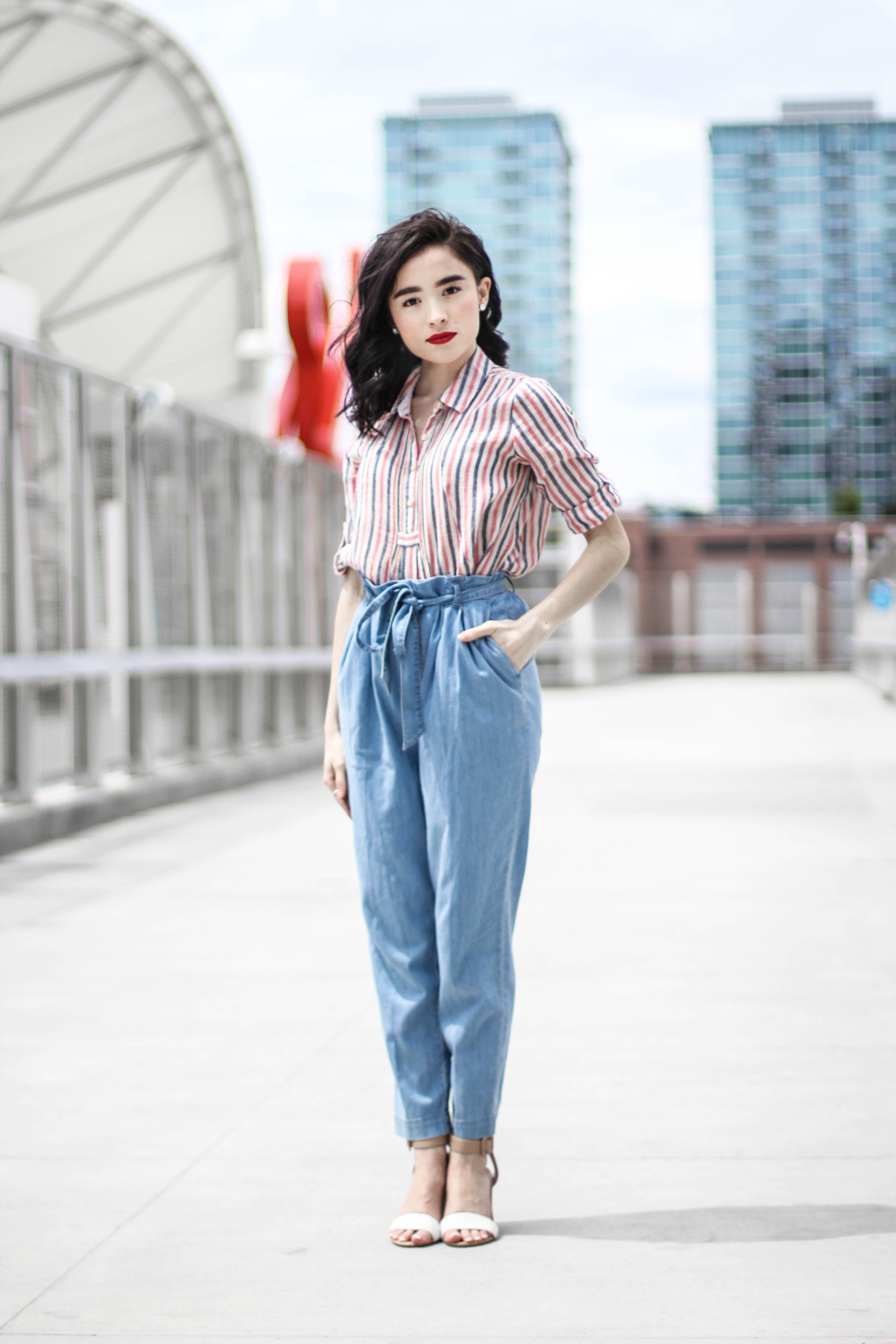 I mean, based on the pictures, can’t you tell how much fun I’m having in my little button down? Wearing button-downs don’t have to be so boring, ladies. In fact, they are the opposite but that’s all up to how you decide to wear it. I absolutely love to wear my button downs (or button up, however you want to say it) with a statement skirt or high waisted trousers. I don’t know what I would do without all of my different pairs of high waisted trousers because they have truly evolved my wardrobe into everything that it was meant to be. As a fashion lover, I can’t go a week without throwing on a pair into my daily wardrobe because they are just so versatile and there’s nothing better to spice up a button down. When I first purchased this blue, white and red striped beauty I was worried it was too “Fourth of July-ish” but that’s not the case at all! Also, there’s nothing wrong with representing our country when it’s not a national holiday…Just a regular Monday will do just fine too! When pairing a button down with anything high waisted, I always make sure that that my button-down can be comfortably tucked into my pants. The length of the top makes such a difference. Good thing this hankercheif style of top is so versatile. Tucked in or out, it WILL turn heads.