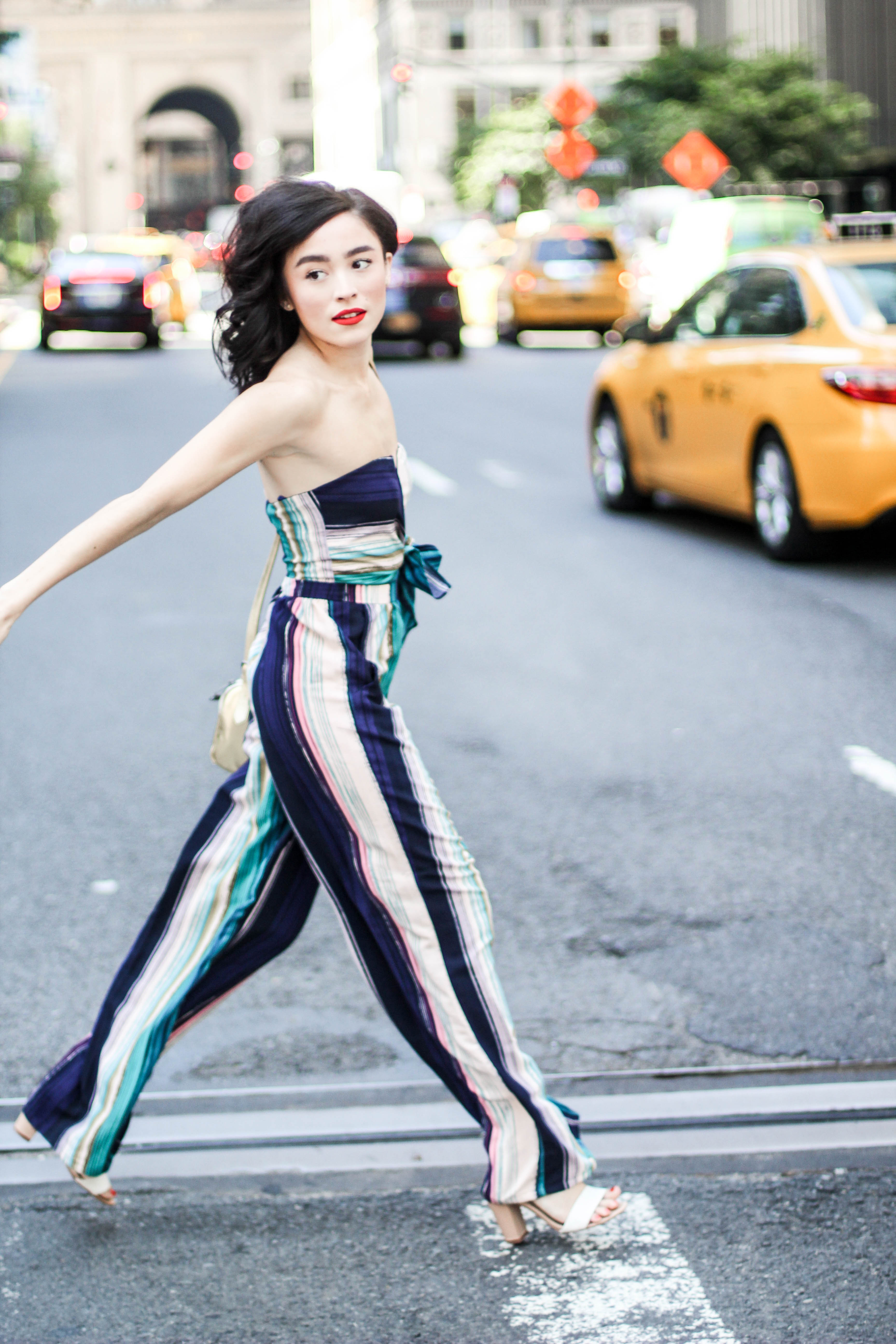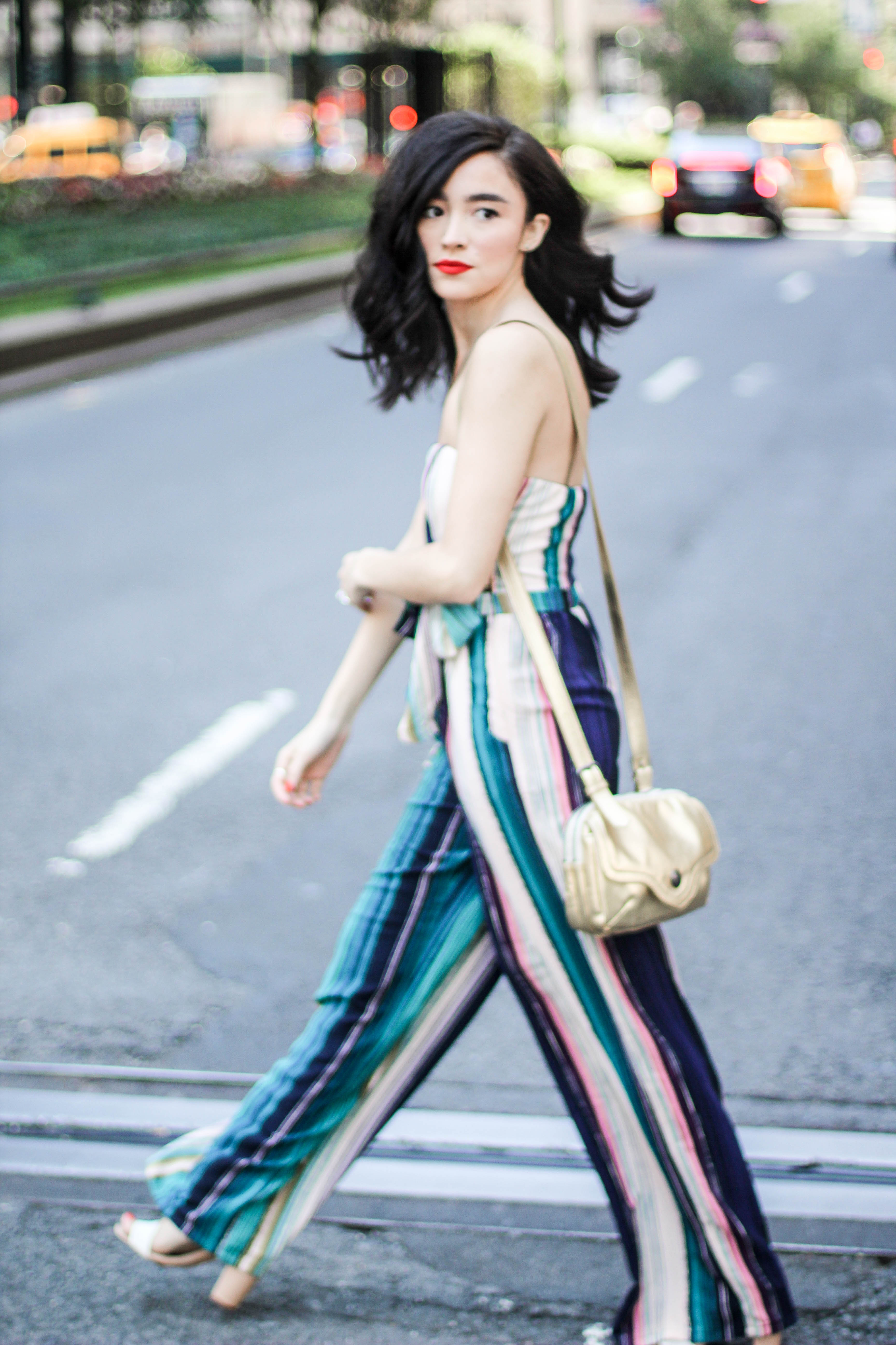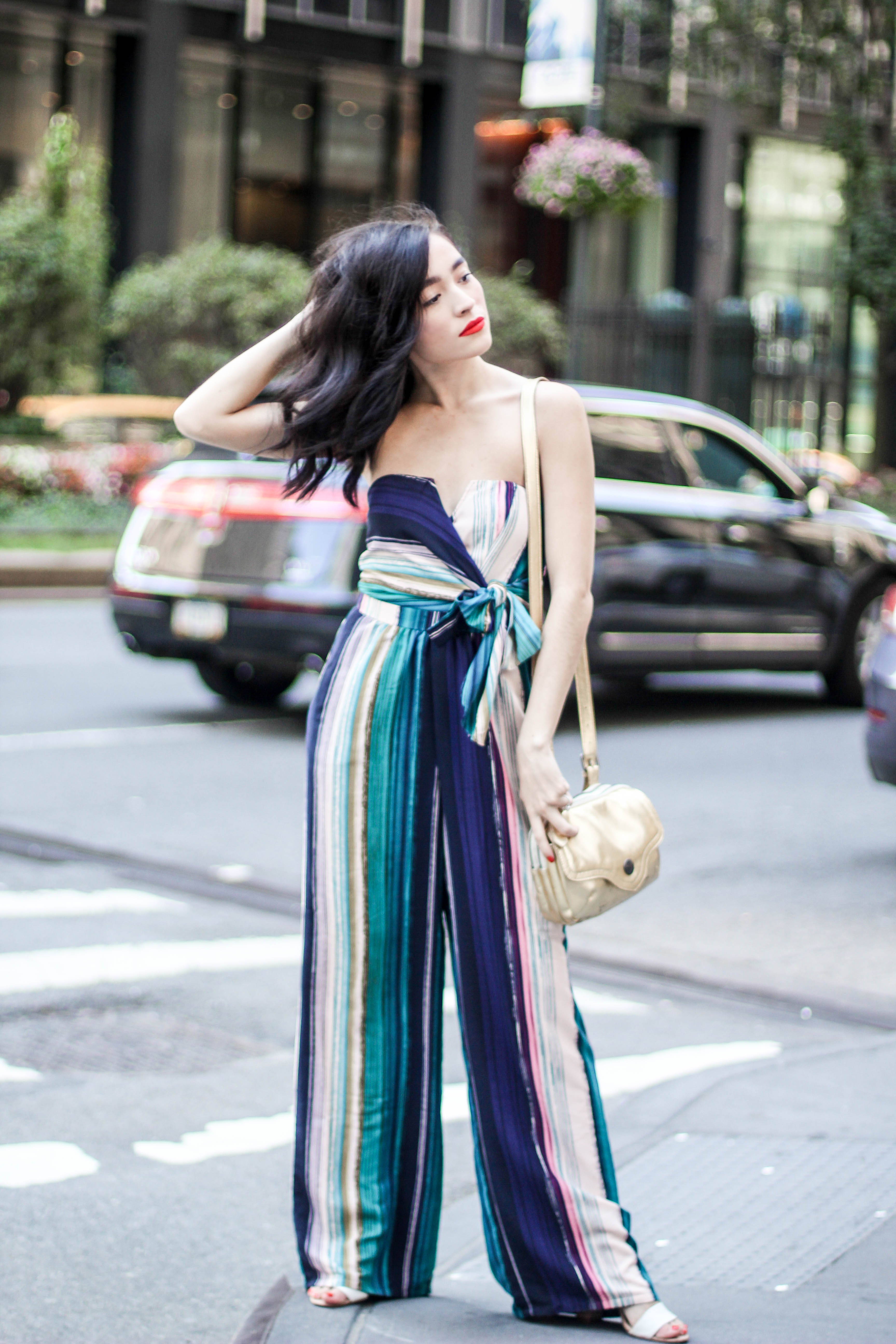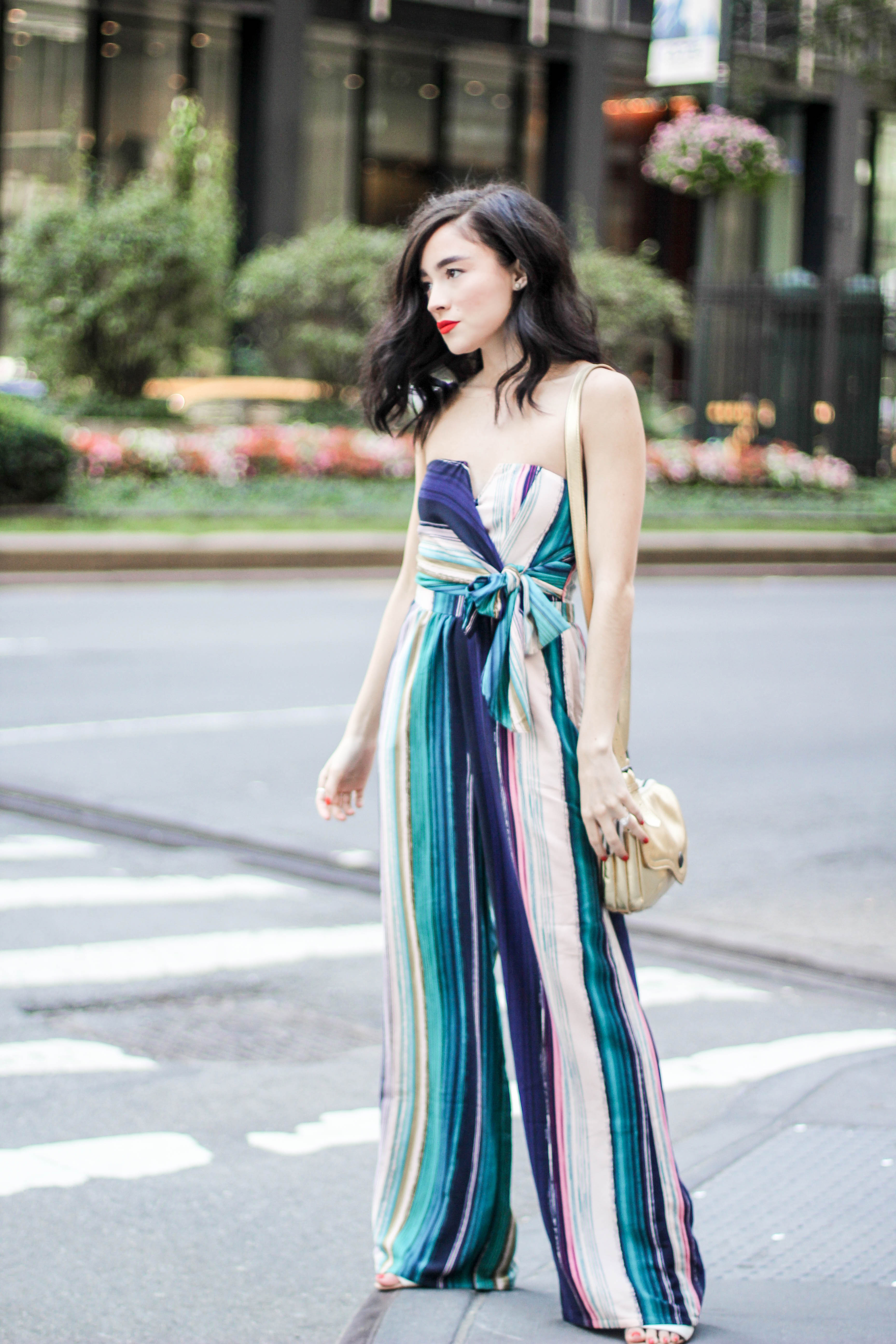 Jumpsuit. Shoes. Lipstick. Purse.