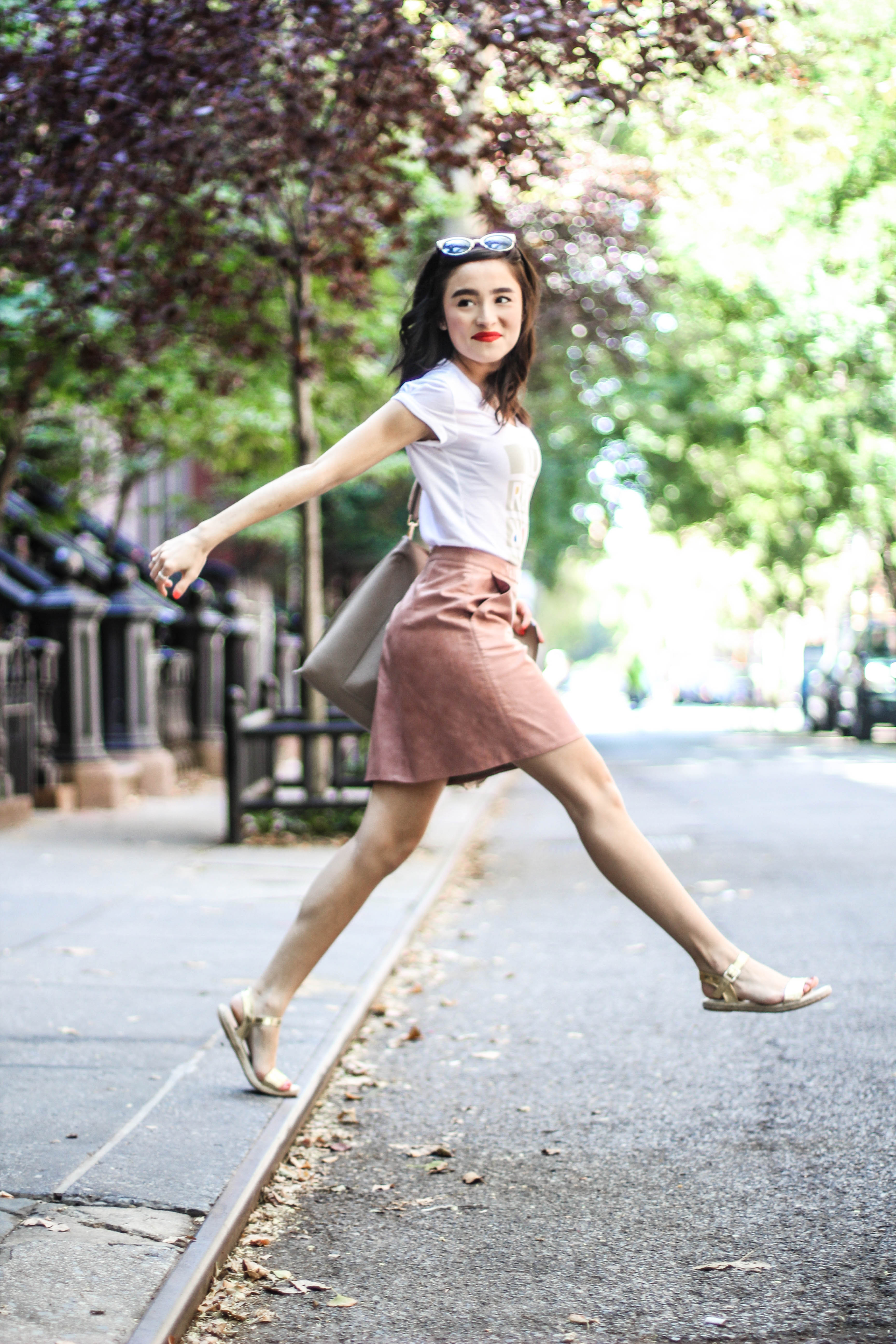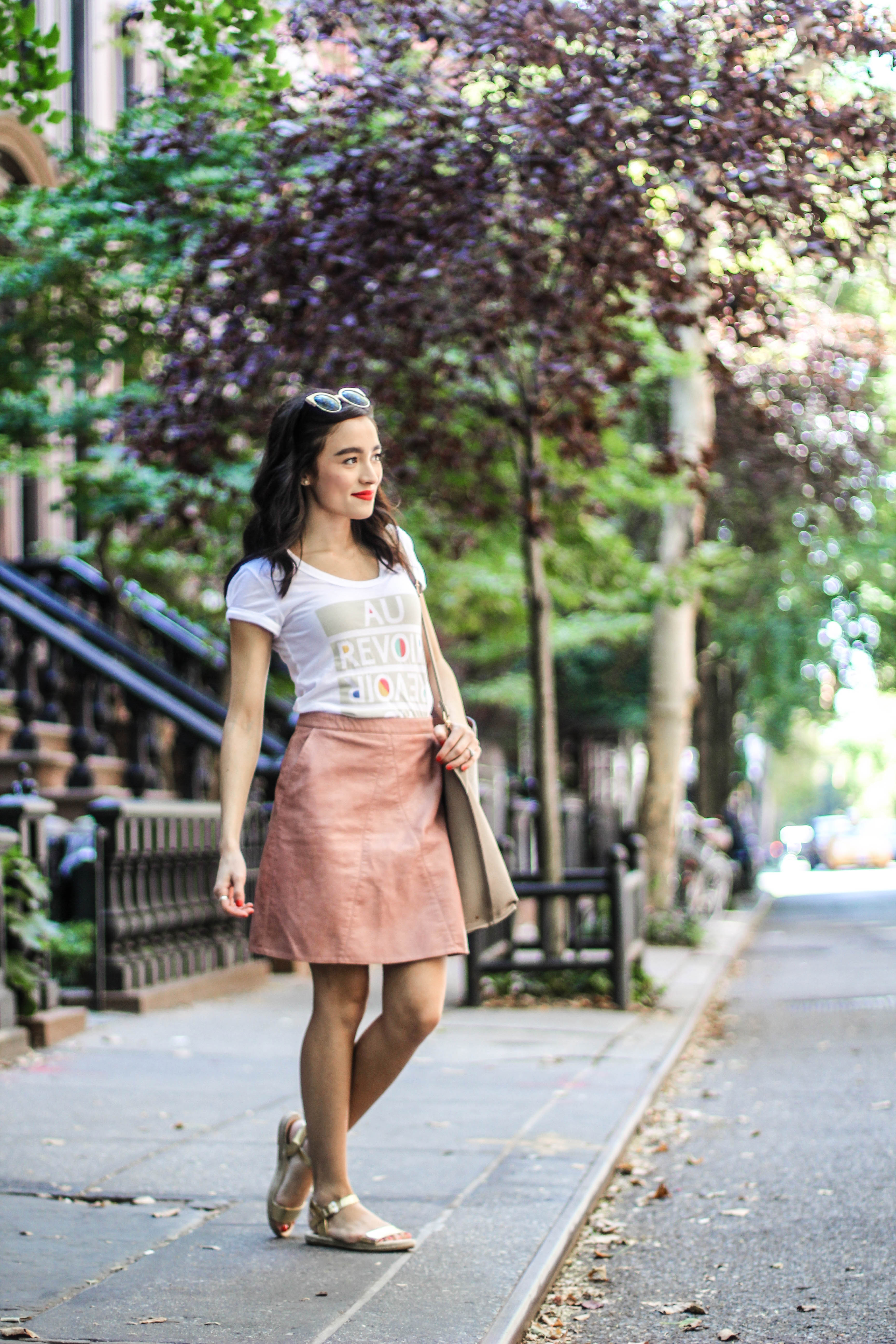 Top. Skirt. Shoes. Purse. Sunglasses.
