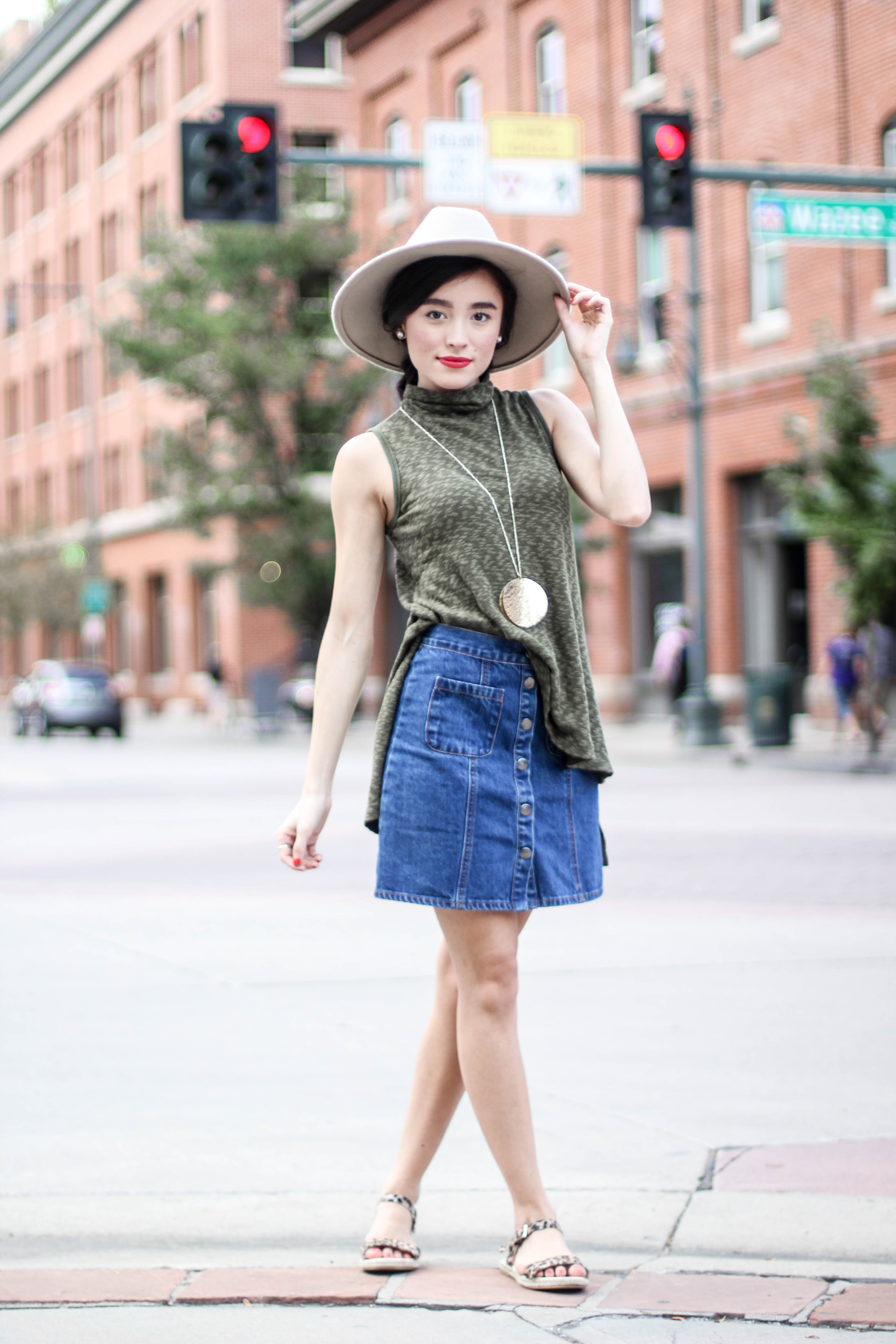 Top. Skirt. Shoes. Fedora. Lipstick