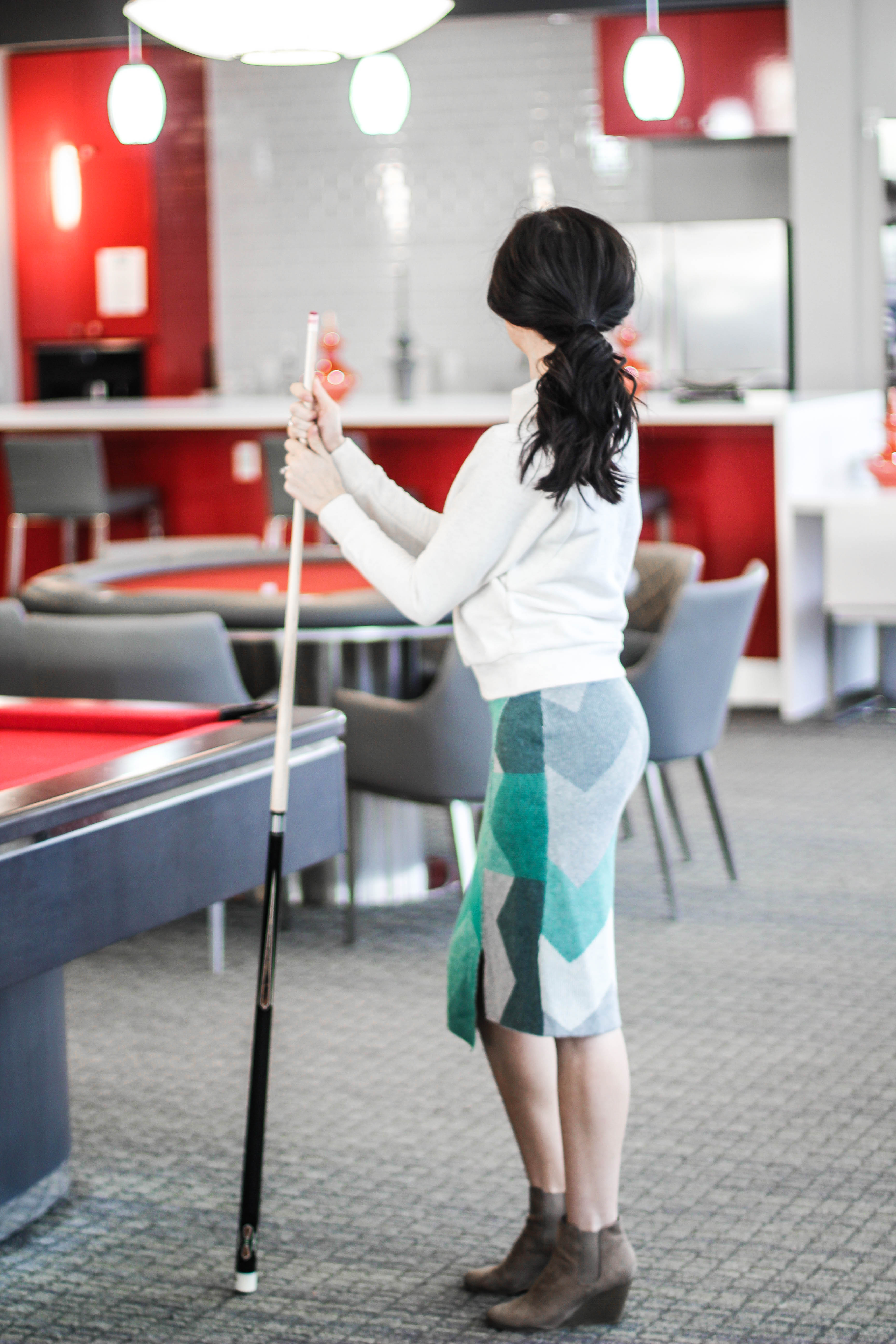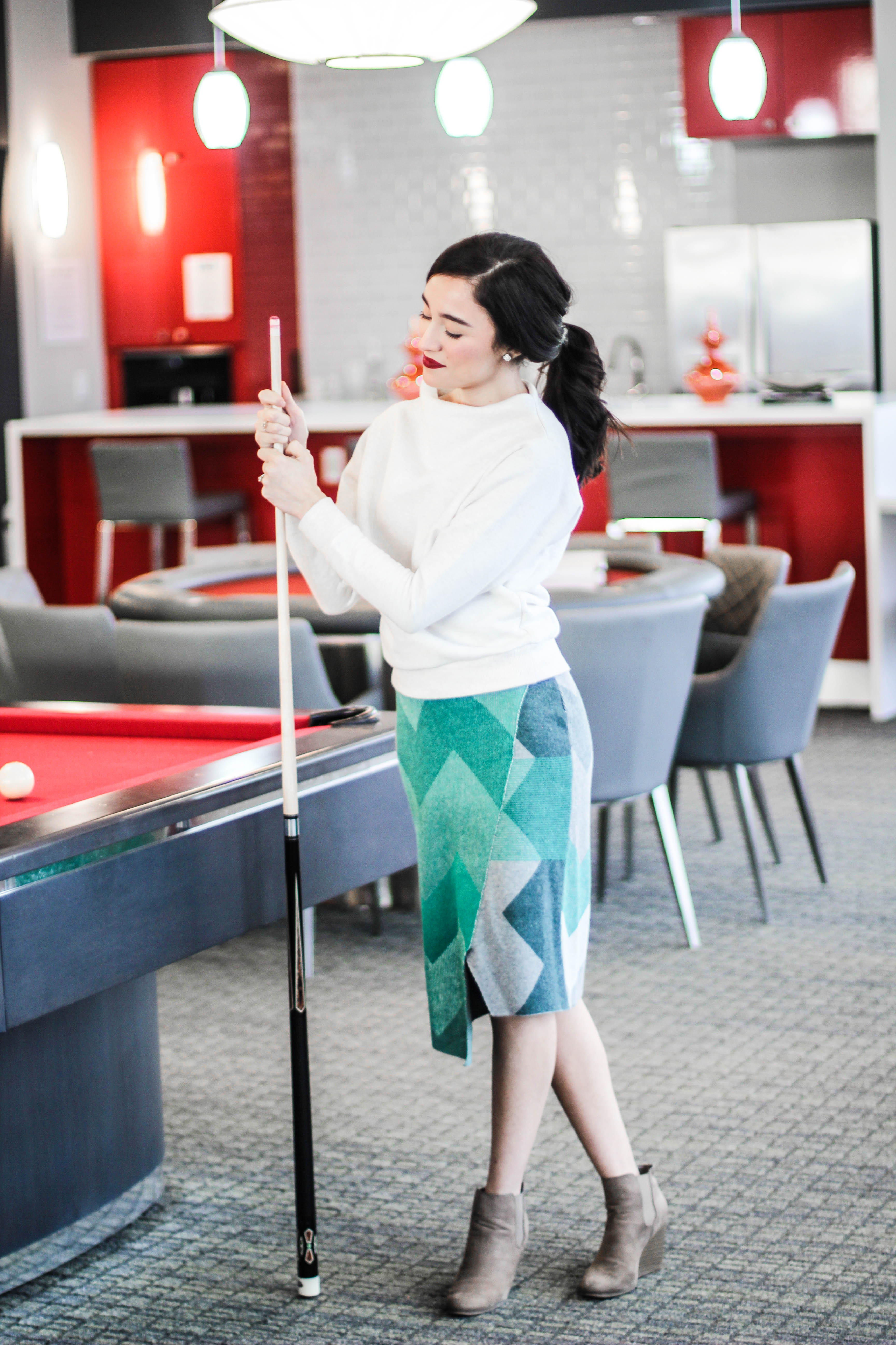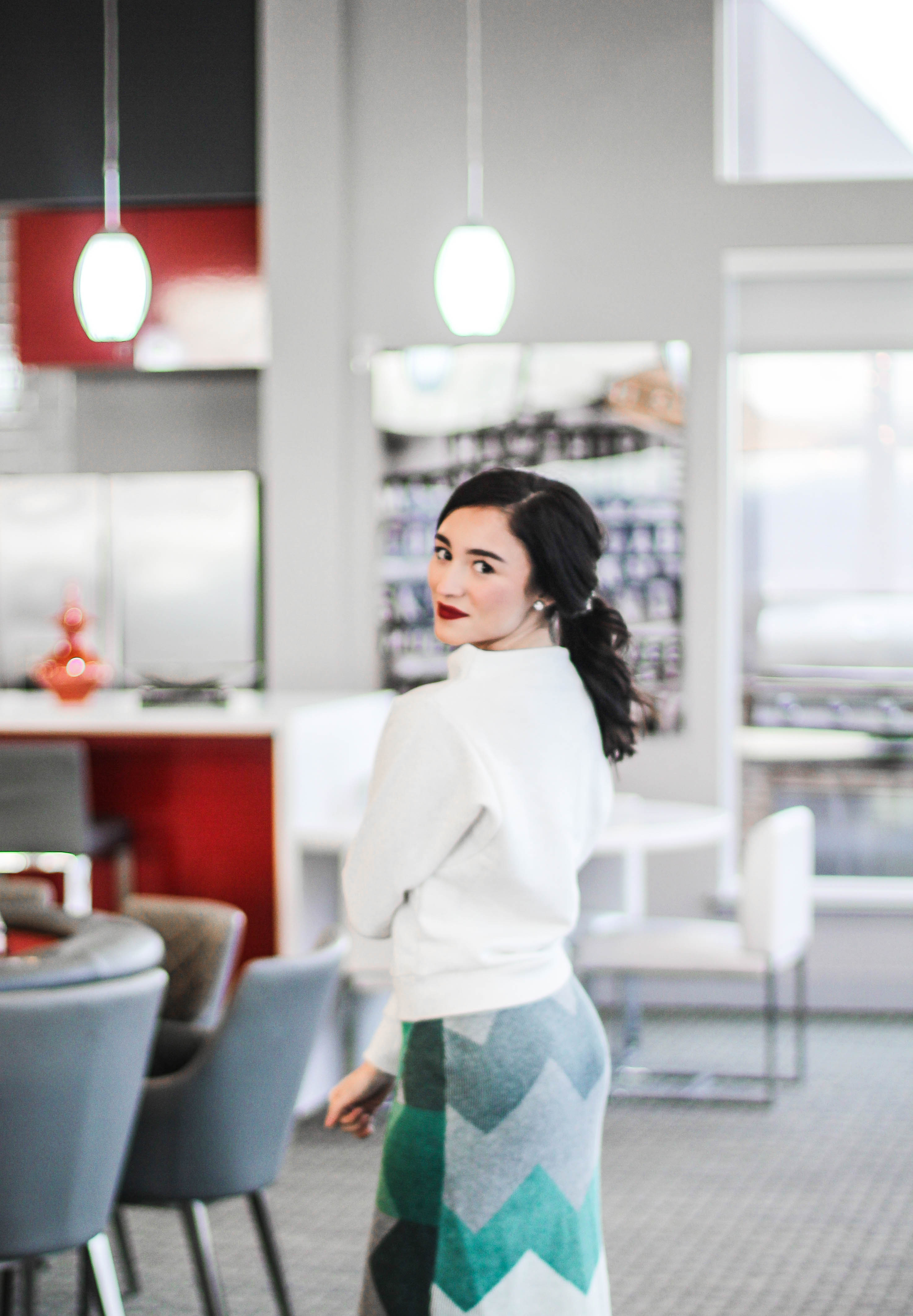 Another recent clothing item in my closet that I just can’t stop gushing over is this fun, chevron printed sweater skirt. Teal and a minimal chevron print in one? Sign me up! This pull-on pencil skirt has been my go to piece and preferred silhouette as of lately. I really can’t stop styling different ways to wear them. Pencil skirts have just been my current fashion craving. Heck, I have more on their way in the mail.