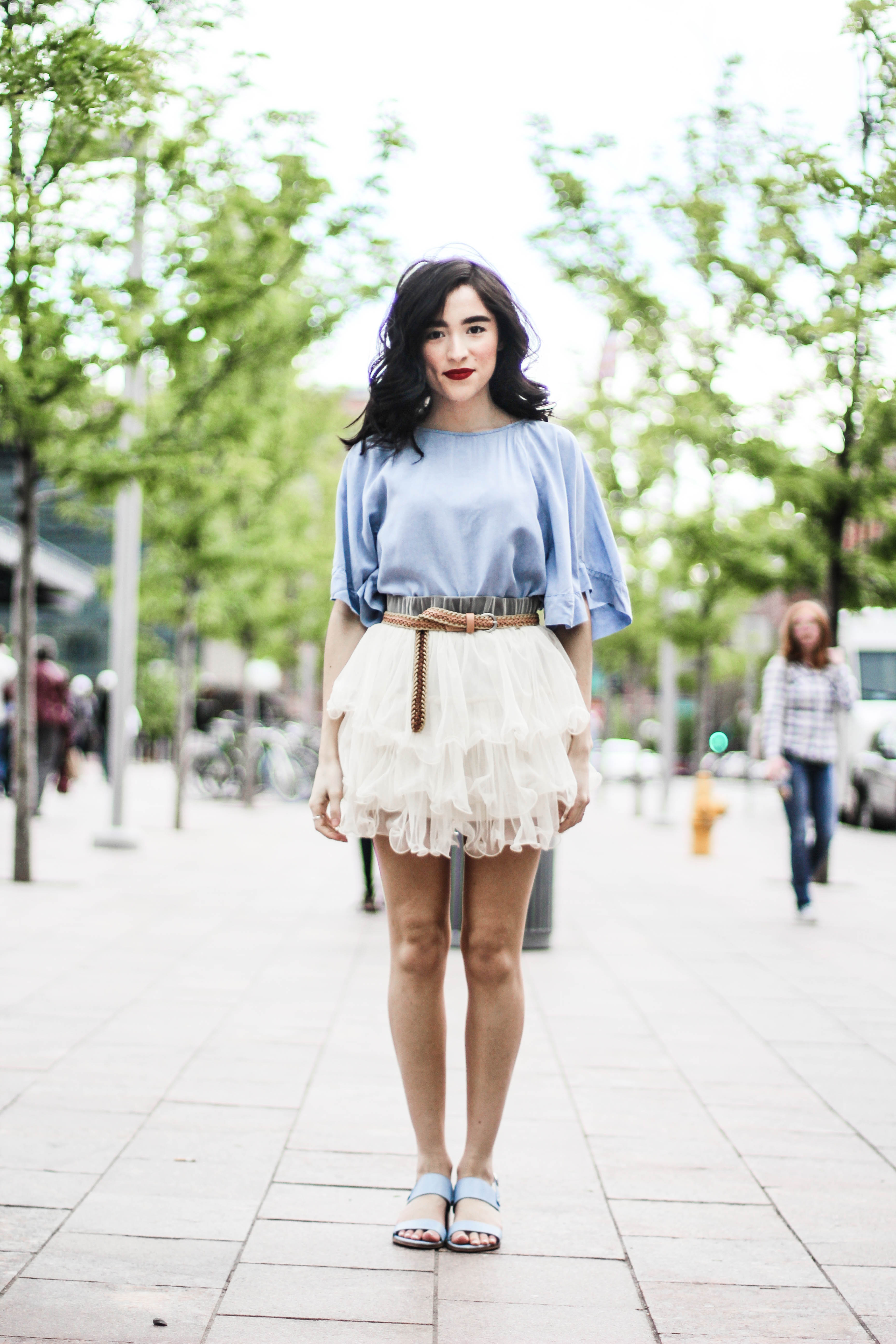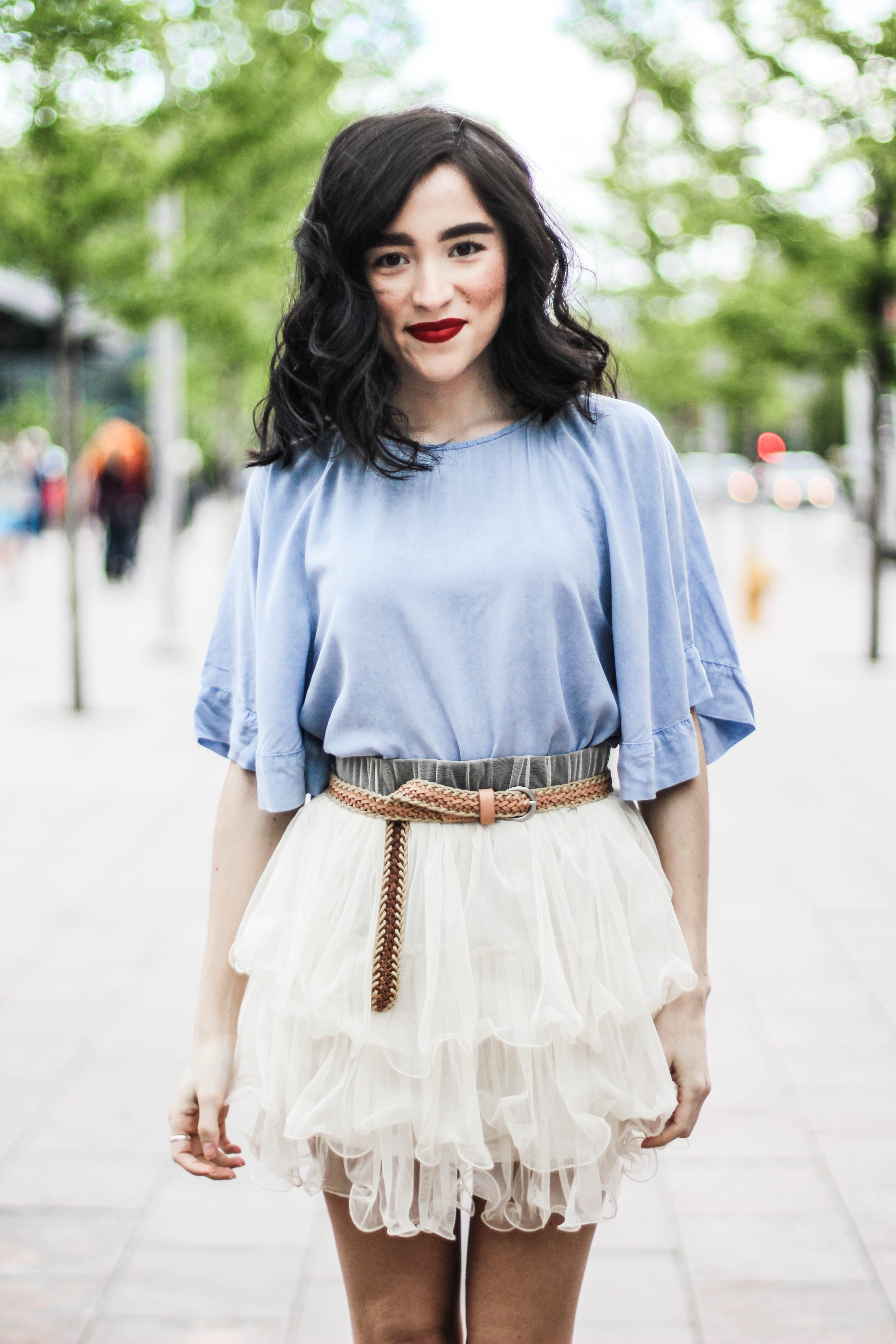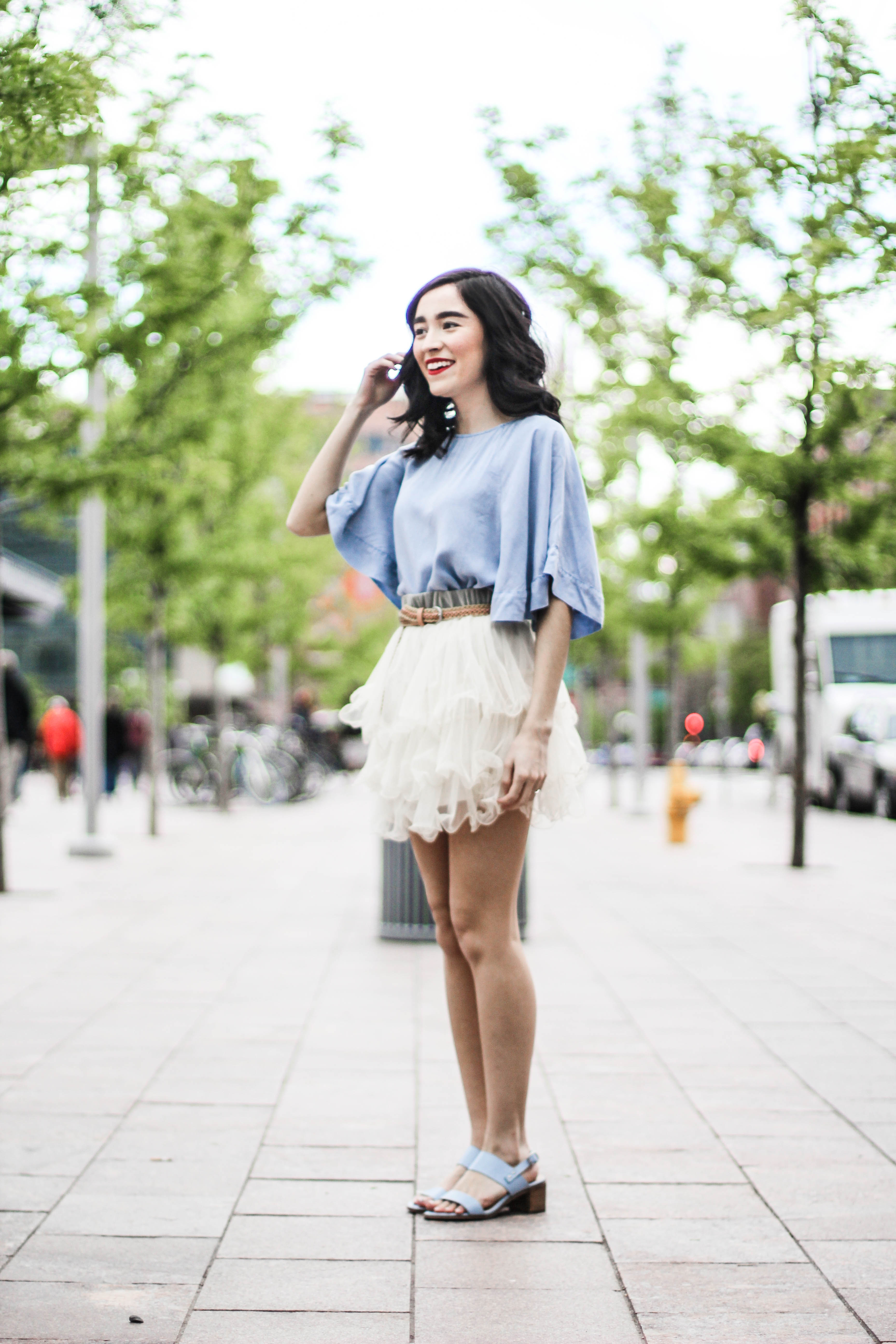 B is for best blouse ever. Bulky, boxy, blouse-y, you know name it, I want to wear it. I’ve always been a fan of shapeless pieces. I love oversized blouses and dresses more than the average girl should. I think what I love about this blouse in particular is the femininity it brings to any outfit. The relaxed butterfly sleeves make me feel like such a girl but completely relaxed all at the same time. Nothing is better than that in my opinion. I really wanted to dress up this light blue beauty to the max to show you what it’s capable of and what colors look best with this shade of blue. I plan on wearing it with many other bottoms besides this statement tulle skirt. My staple black skinny jeans or my current favorite bow-tie shorts are great candidates as well. The possibilities are nearly endless.