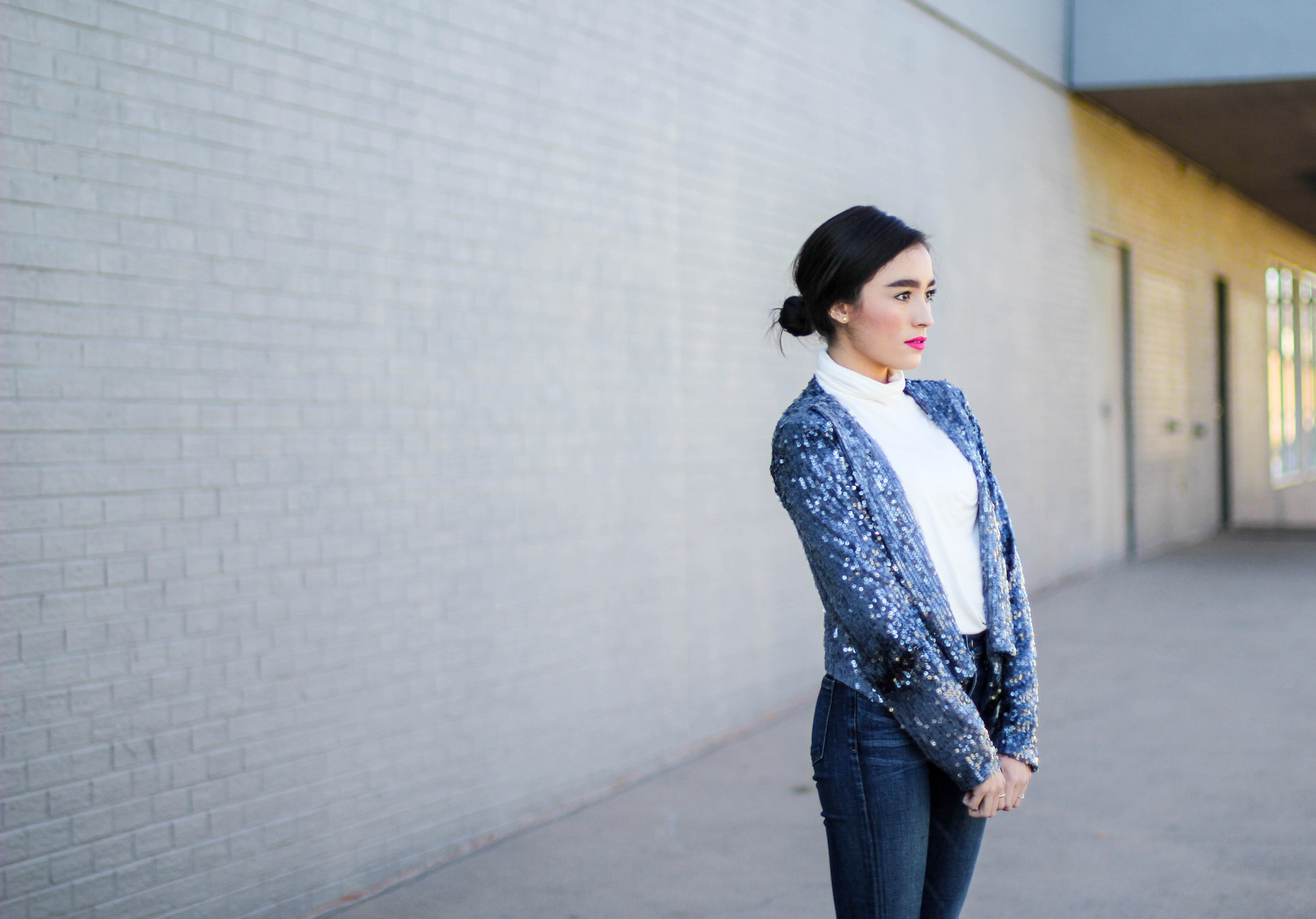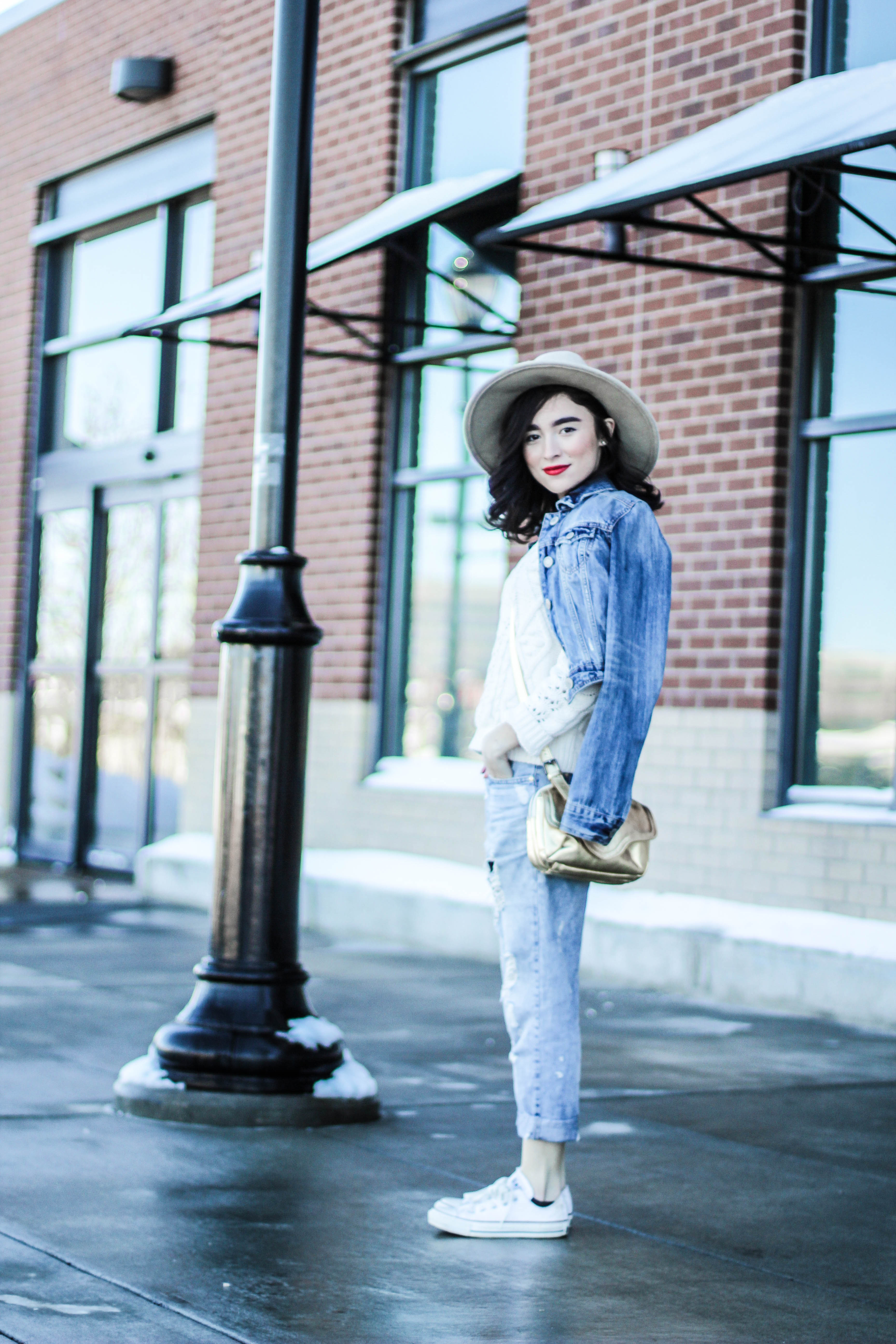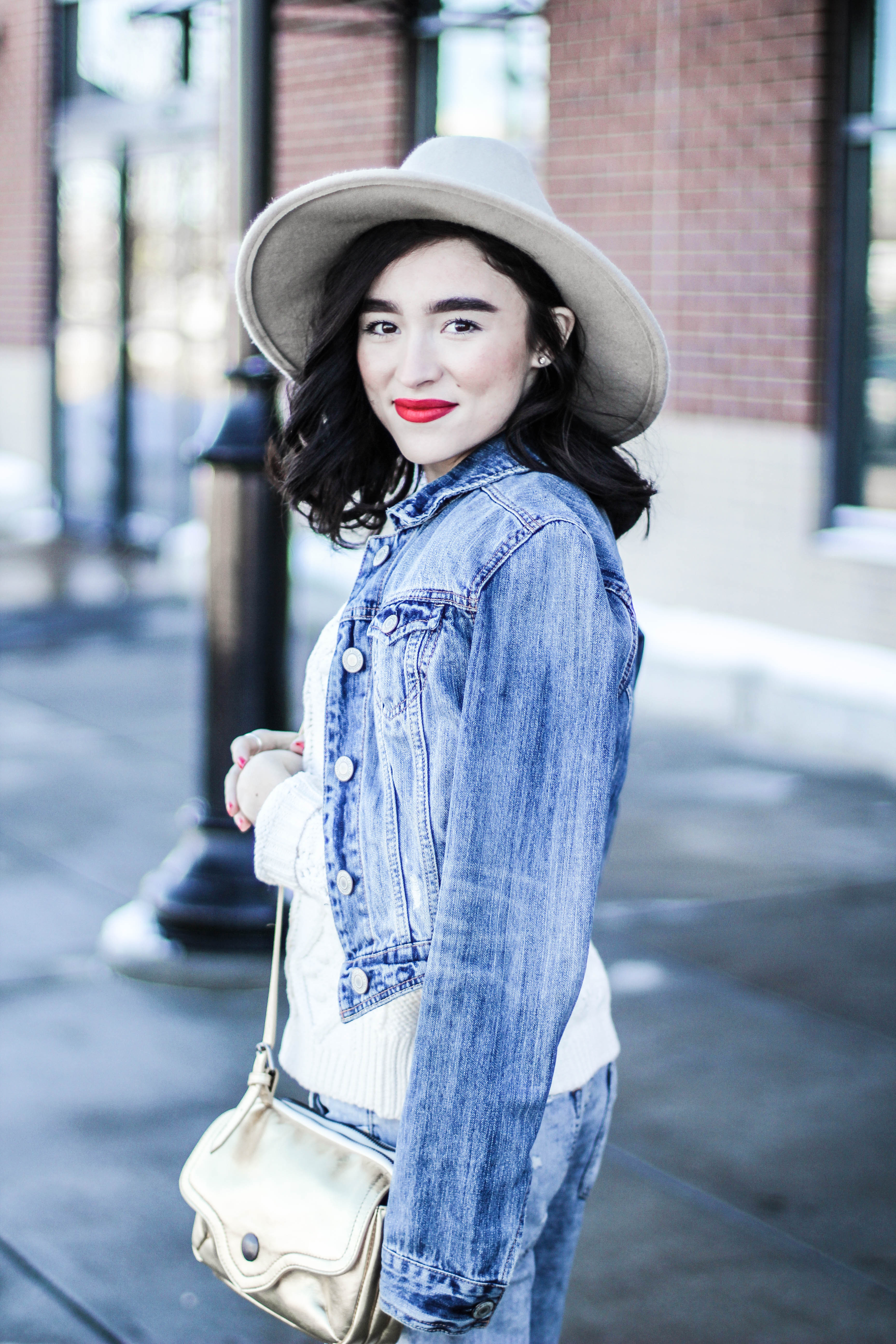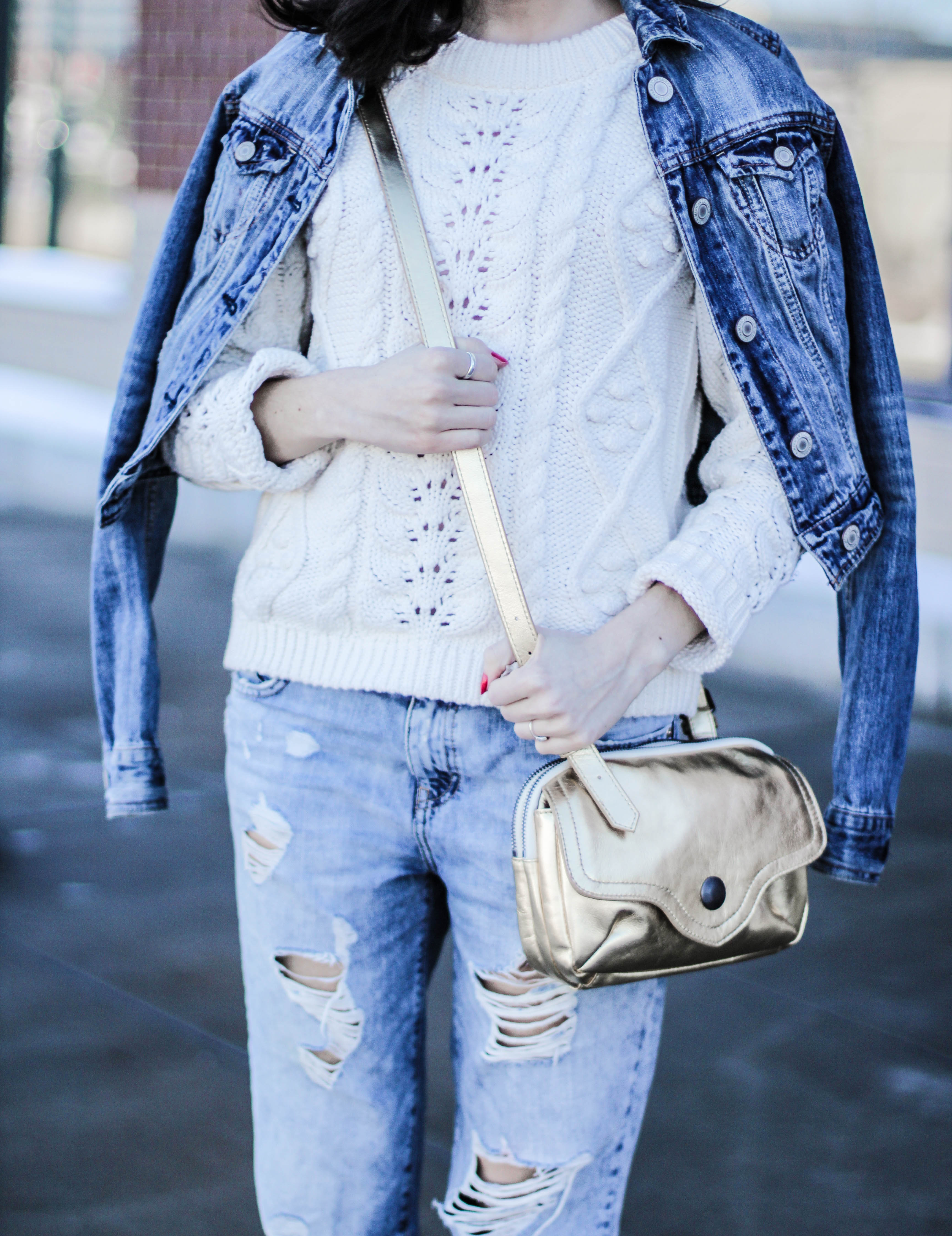 If you thought this post had anything to do with the movie “50 Shades of Grey” you can go ahead and click the x at the top right of your screen and get the heck out of here because no sir, no thank you. I will not be “submitted” into that kind of behavior. (Ha. I’m so clever.) No chains or whips could hold me back from wearing an all denim outfit. I’m having so much pun. Okay, I’ll stop. Back to the outfit: I wear denim on denim time and time again because I don’t think this trend ever goes of style. I didn’t want to go overboard on denim today so I threw on my all time favorite sweater to mute out the bursts of blue that’s happening in these shots. The beauty of an all denim look is that you don’t have to stress one bit about what color of lipstick to wear. You could wear a bright yellow lipstick and it would still look good. I chose red because I’m on a red lip kick right now. Keeping it classic is always a good, safe choice. I kept this look casual with converse shoes but had to fancy-it-up a little with a touch of gold aka my purse soulmate.