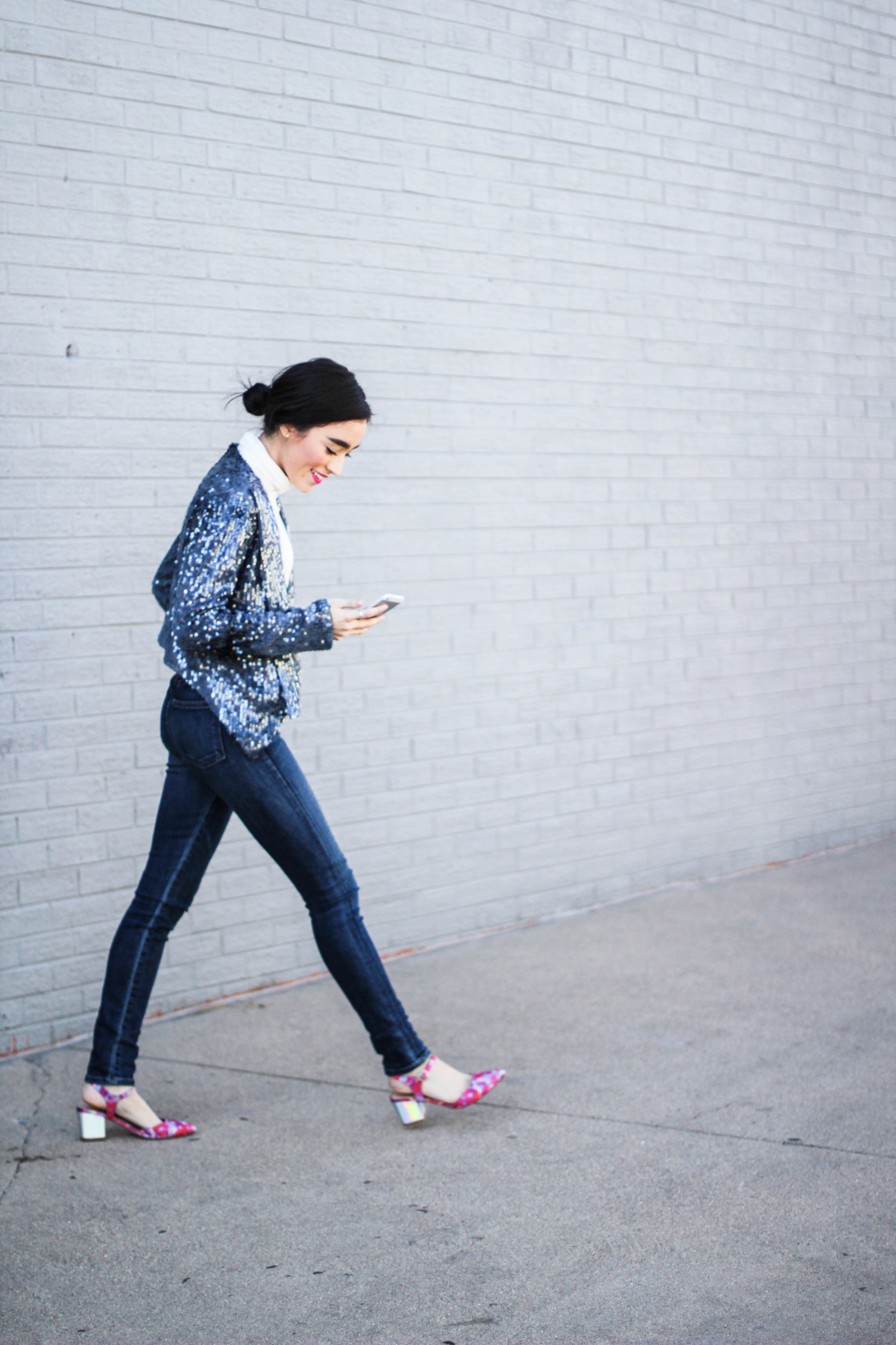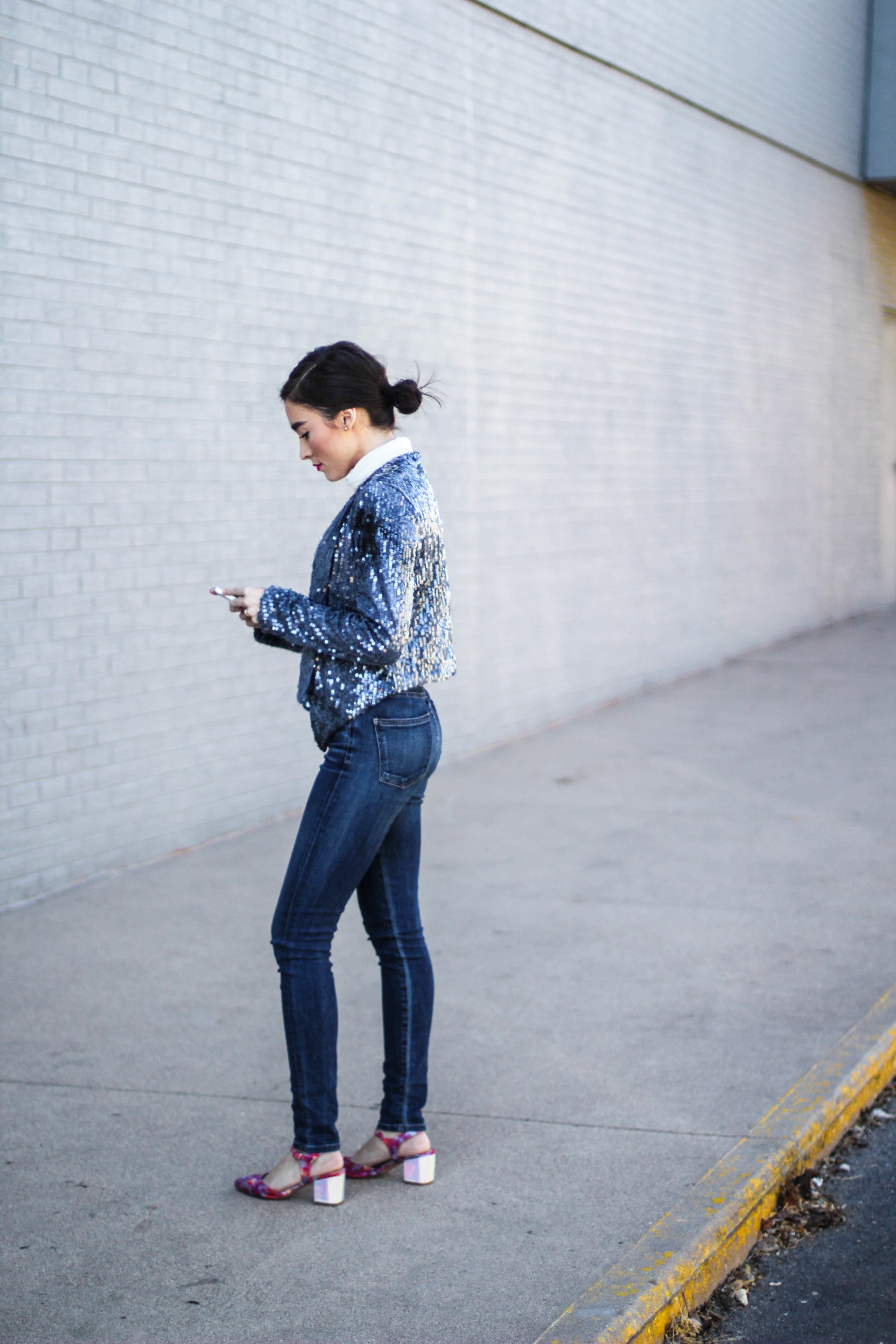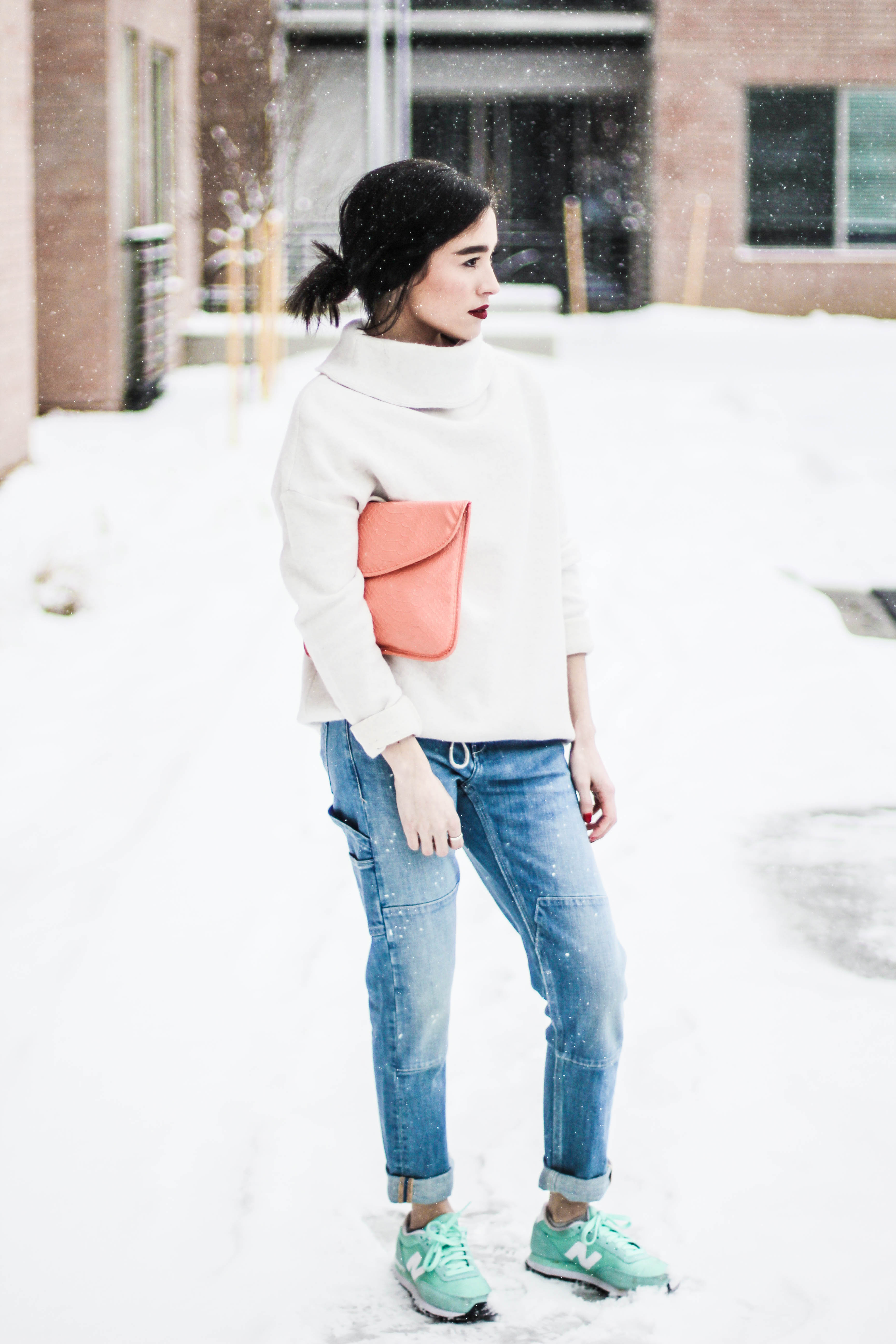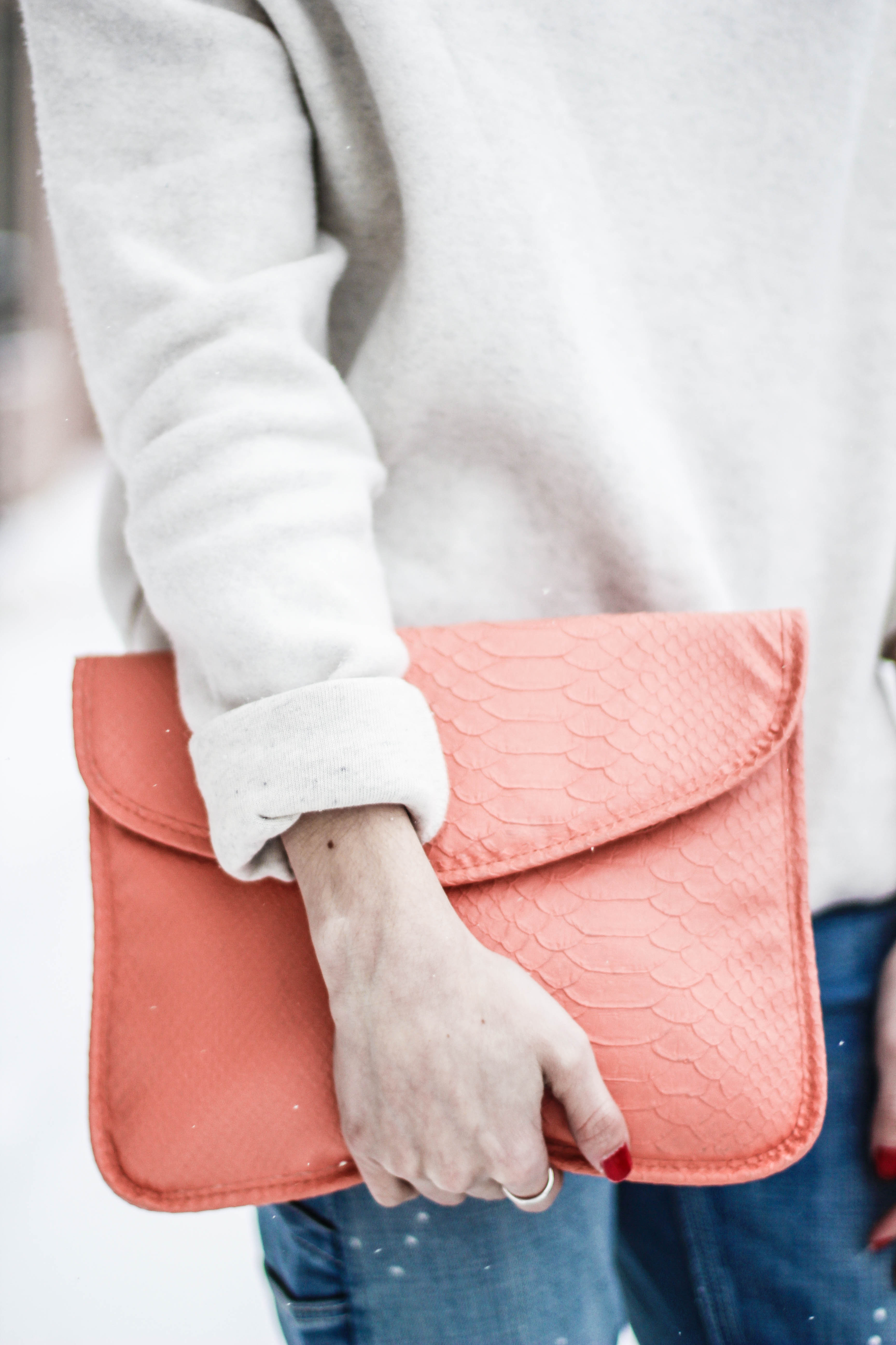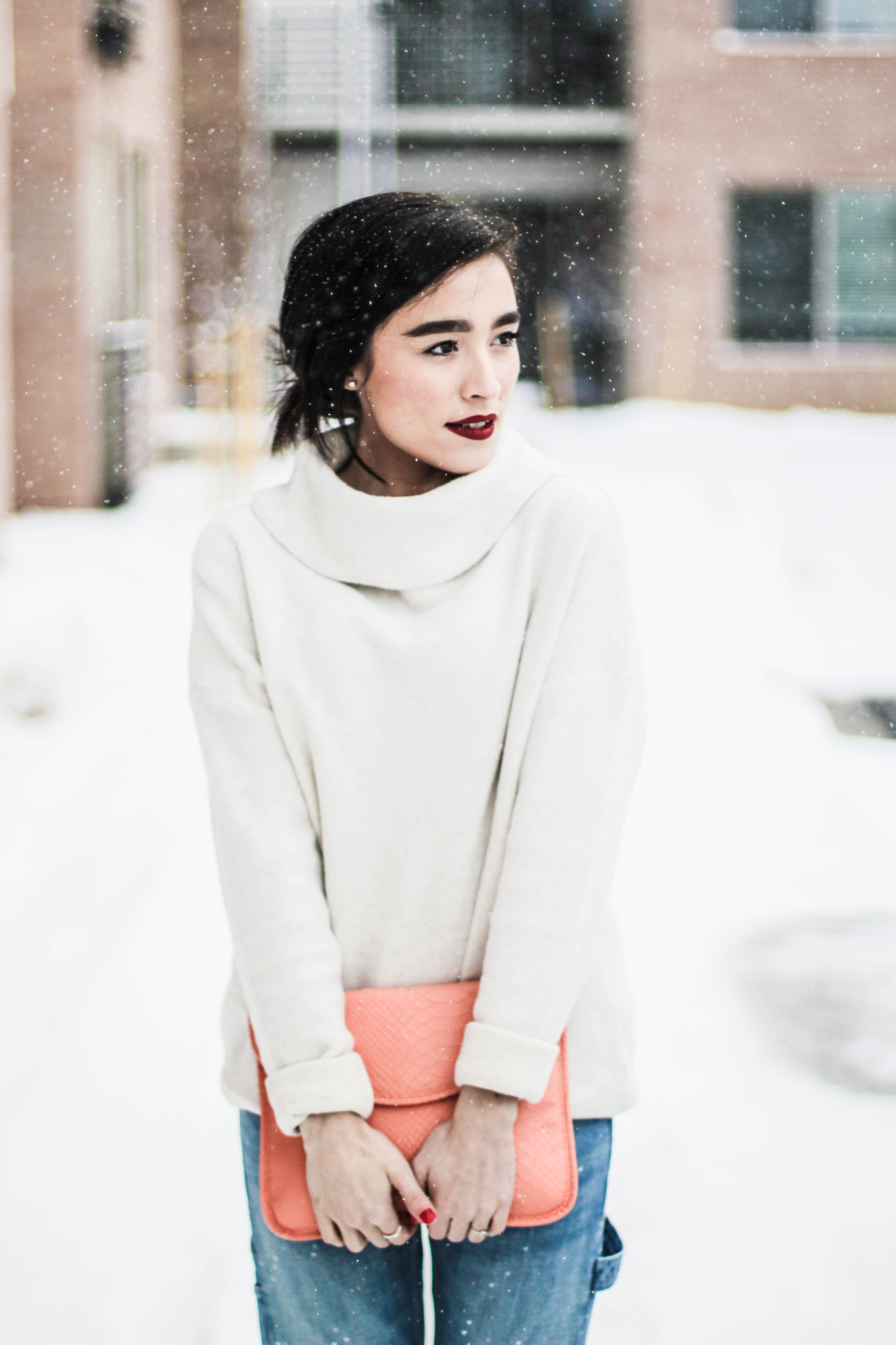 If you thought this post had anything to do with the movie “50 Shades of Grey” you can go ahead and click the x at the top right of your screen and get the heck out of here because no sir, no thank you. I will not be “submitted” into that kind of behavior. (Ha. I’m so clever.) No chains or whips could hold me back from wearing an all denim outfit. I’m having so much pun. Okay, I’ll stop. Back to the outfit: I wear denim on denim time and time again because I don’t think this trend ever goes of style. I didn’t want to go overboard on denim today so I threw on my all time favorite sweater to mute out the bursts of blue that’s happening in these shots. The beauty of an all denim look is that you don’t have to stress one bit about what color of lipstick to wear. You could wear a bright yellow lipstick and it would still look good. I chose red because I’m on a red lip kick right now. Keeping it classic is always a good, safe choice. I kept this look casual with converse shoes but had to fancy-it-up a little with a touch of gold aka my purse soulmate.