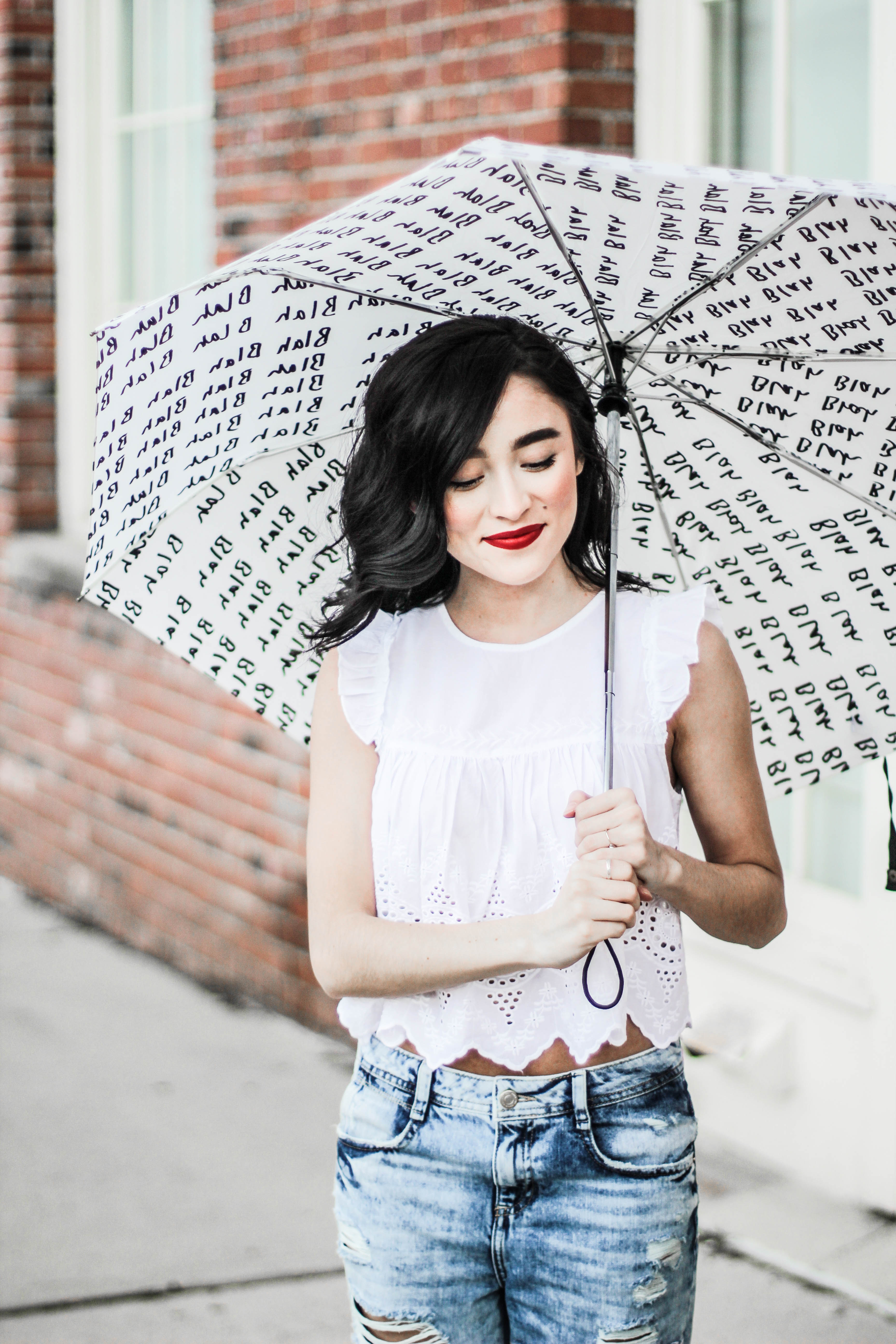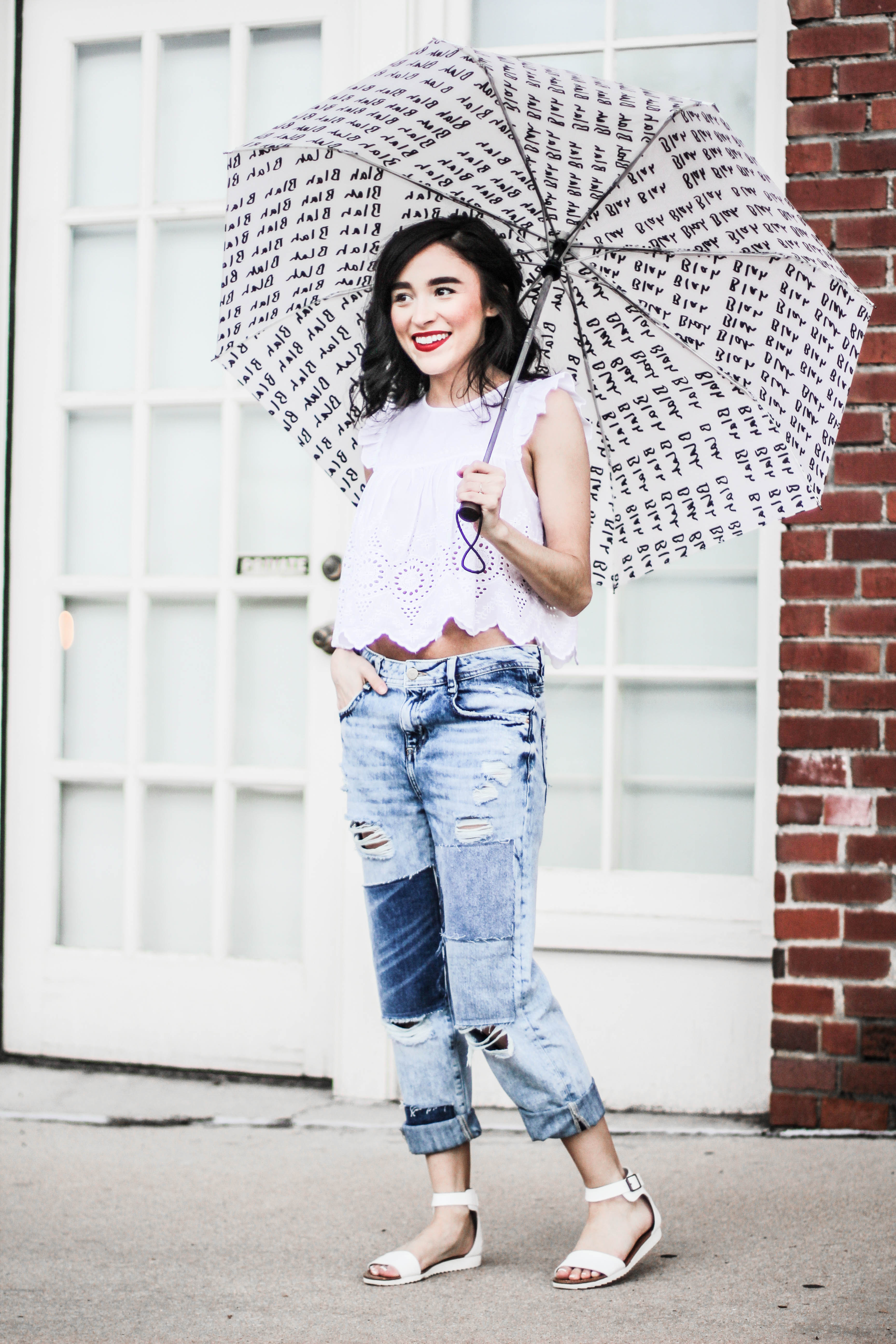 IMG_9310 IMG_9324 IMG_9317 IMG_9334 IMG_9322 IMG_9314 IMG_9338The rain doesn’t want to stop but neither will I. I refuse to let the weather determine my outfits so I decided to throw in my favorite J.Crew umbrella to protect me from this lousy weather. This umbrella isn’t the only statement piece in this outfit post. I really think this flounce sleeve top and patched jeans are really the ones that catch people’s attention. I cannot express to you enough how much I love this simple combo. I wore this to a Rockies game with Wyatt and threw on a leather jacket because it was an evening game. People would stop me, asking me where I got my ‘over the top’ distressed jeans. I think every girl needs a pair because they really make outfitting so much fun. I love that laid back girly kind of look and I’ve been rocking it non stop so far this summer.